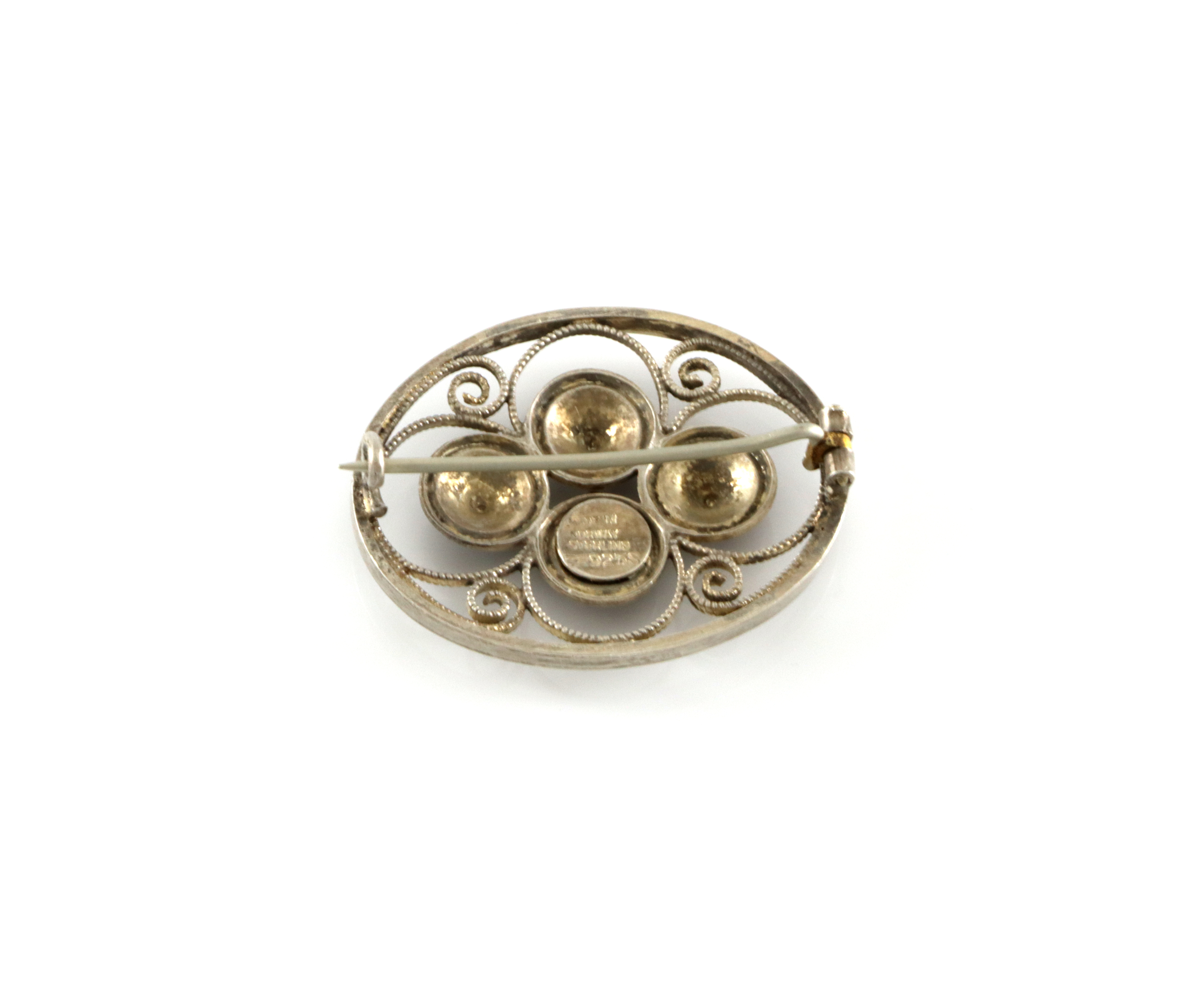 Brosje i sølv med svart emalje. Produsert av Aksel Holmsen 3,3 x 2,7 cm