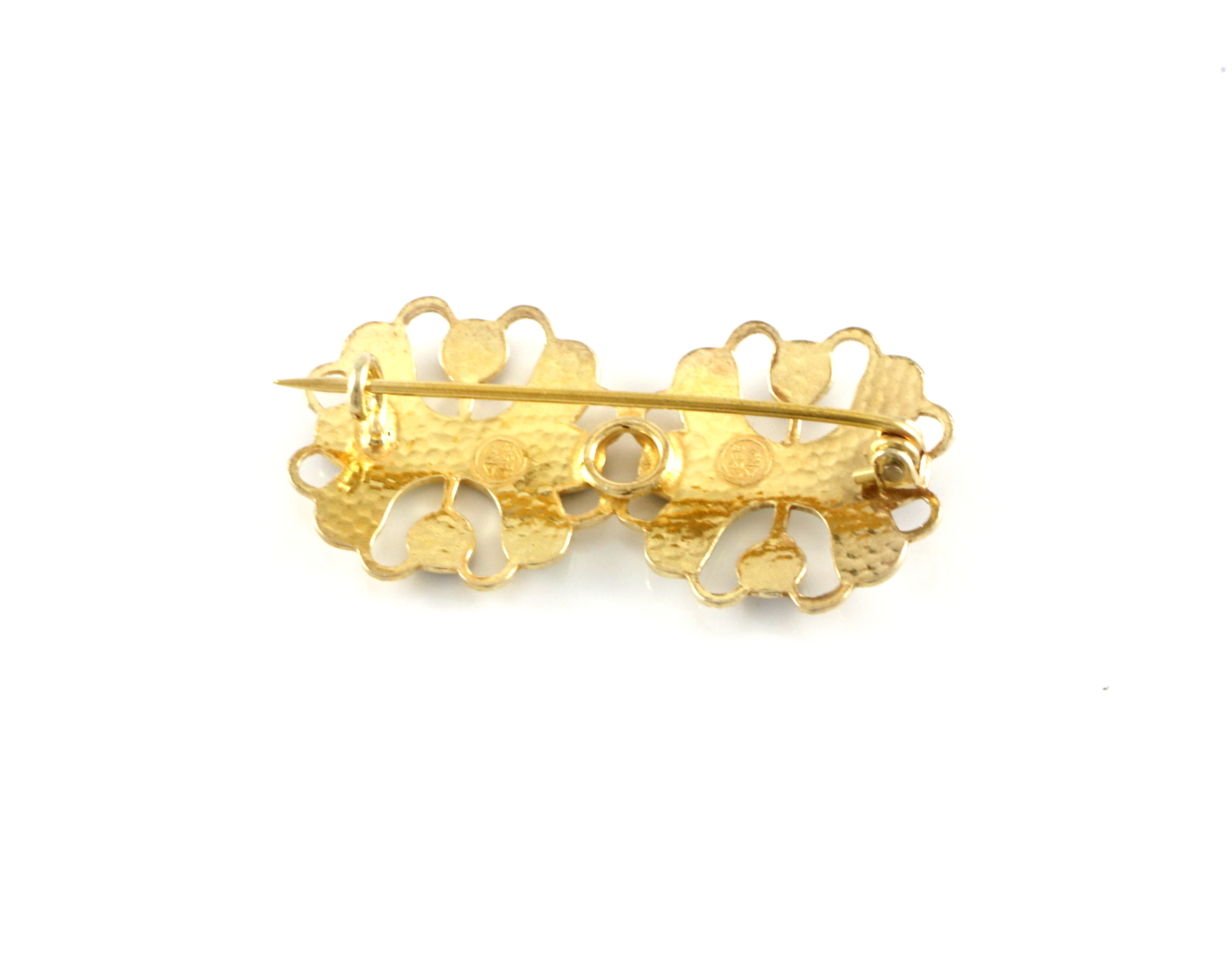 Brosje i forgylt sølv med sort og hvit emalje. Produsert av Arne Nordlie 4,2 x 2,1 cm