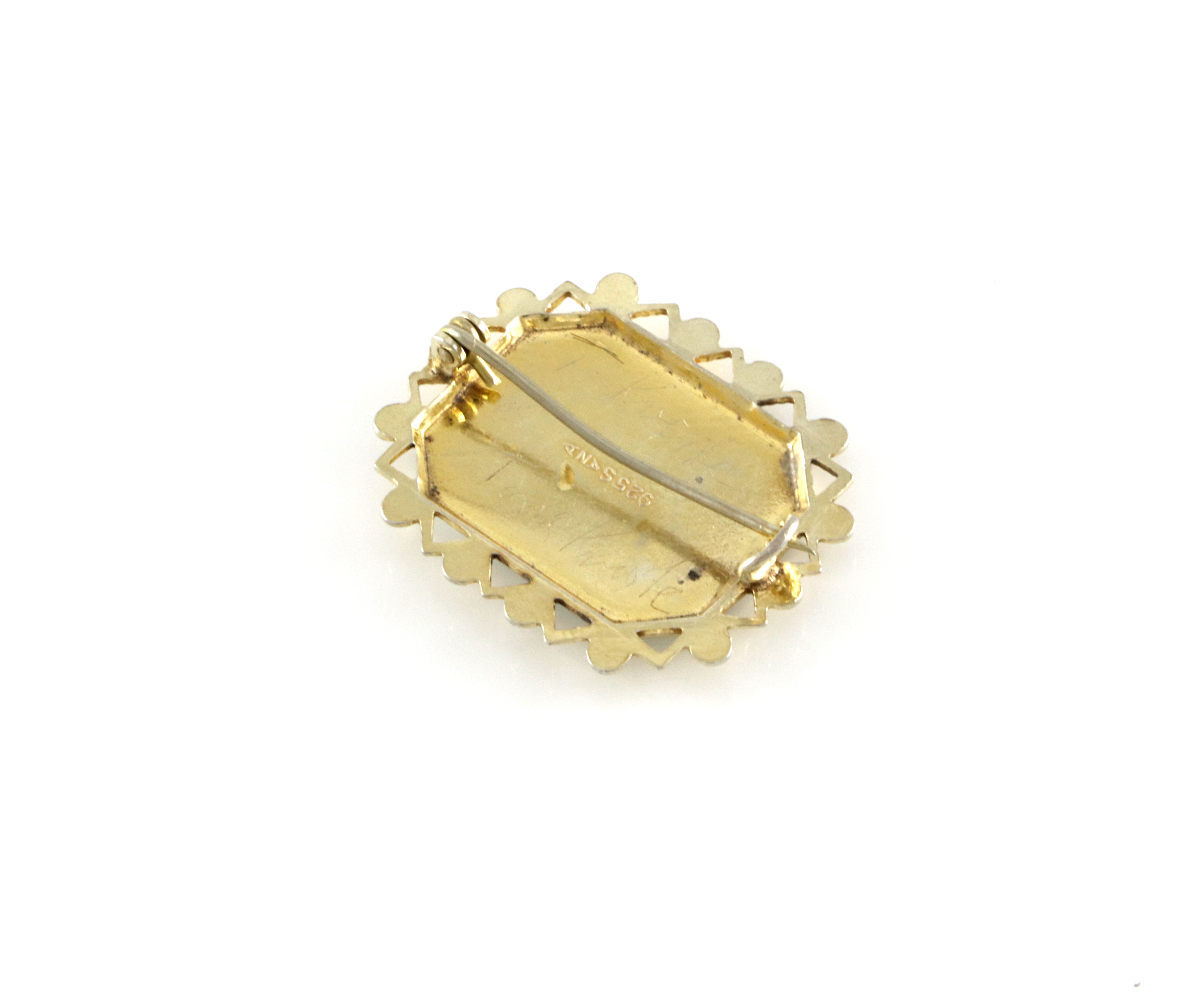 Brosje i forgylt sølv med rosemotiv og hvit emalje. Produsert av Arne Nordlie. 3,0 x 2,6 cm
