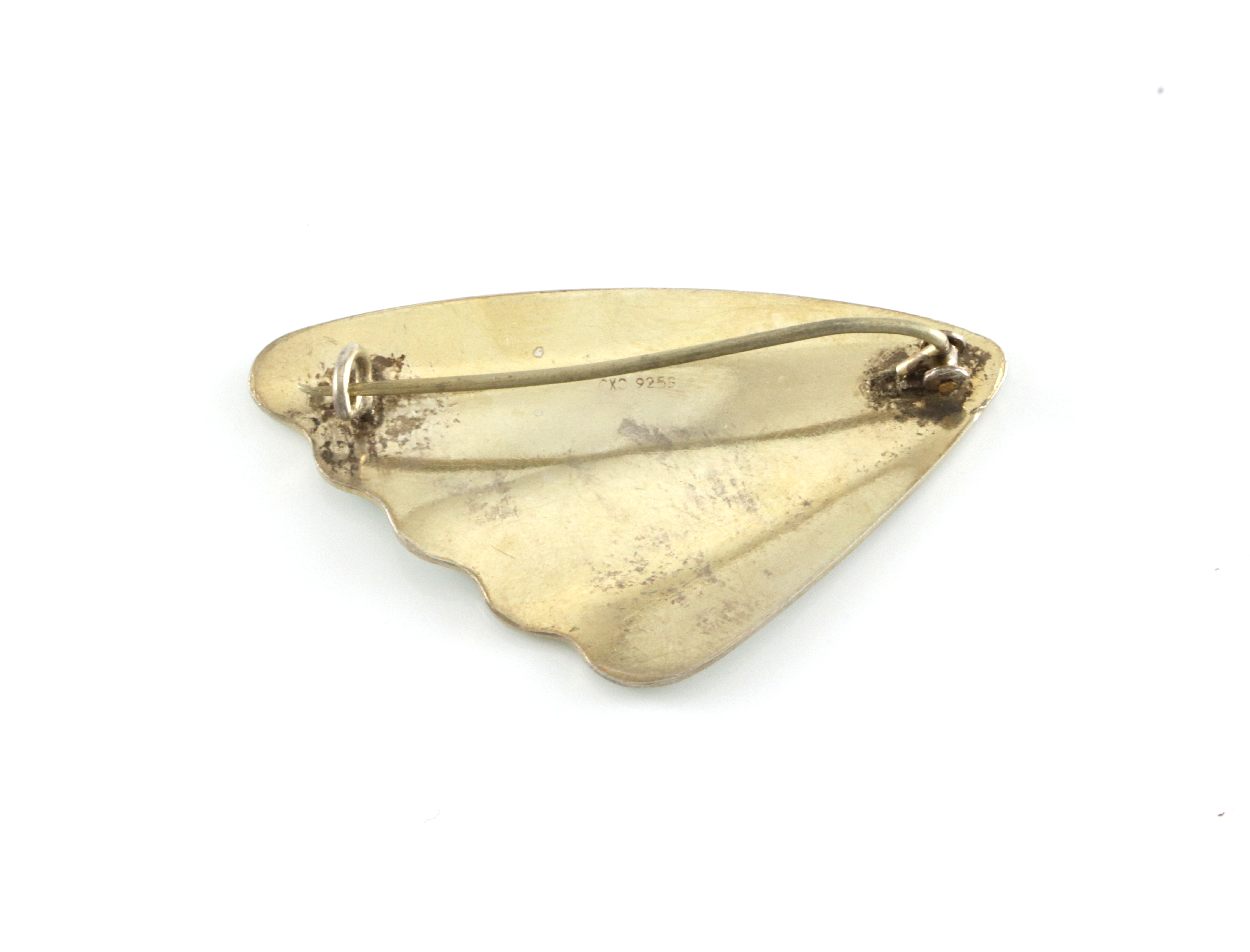 Brosje i forgylt sølv med hvit emalje. Mesterstemplet CND 5,0 x 3,0 cm