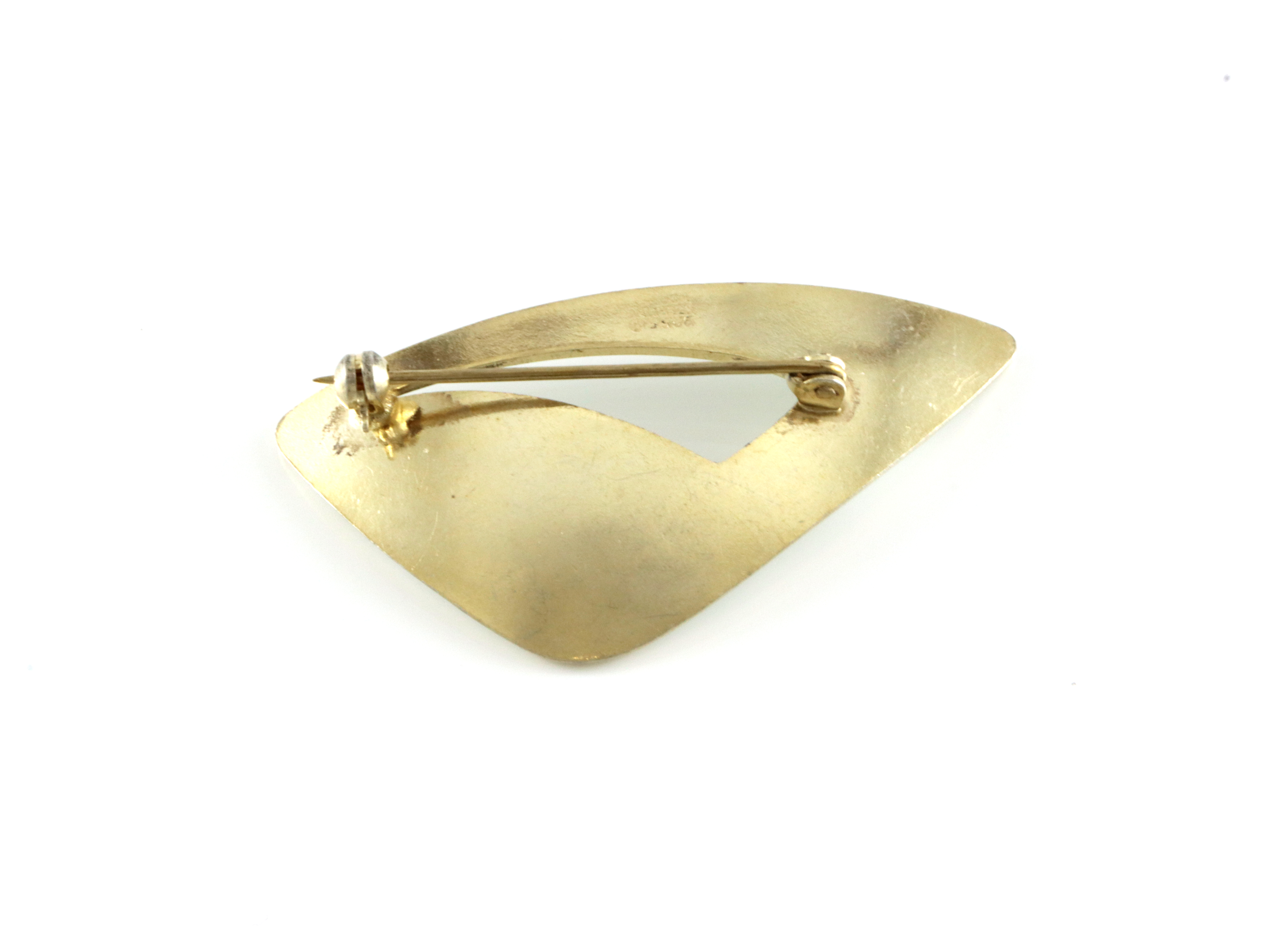 Brosje i forgylt sølv med hvit emalje. Produsert av Ivar T Holth 4,9 x 2,5 cm