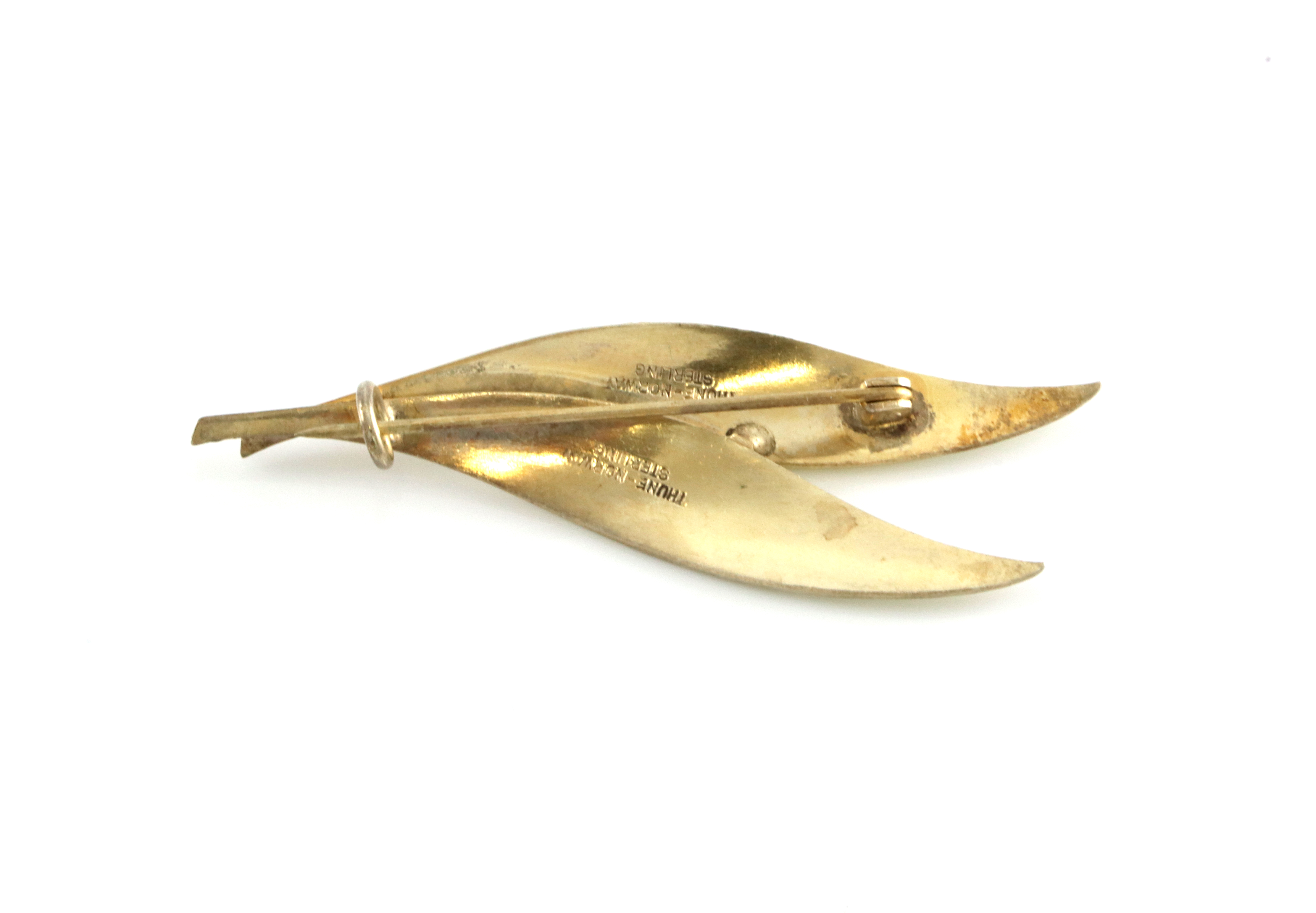 Brosje i forgylt sølv med hvit emalje. Produsert av Thune. 6,2 x 1,8 cm