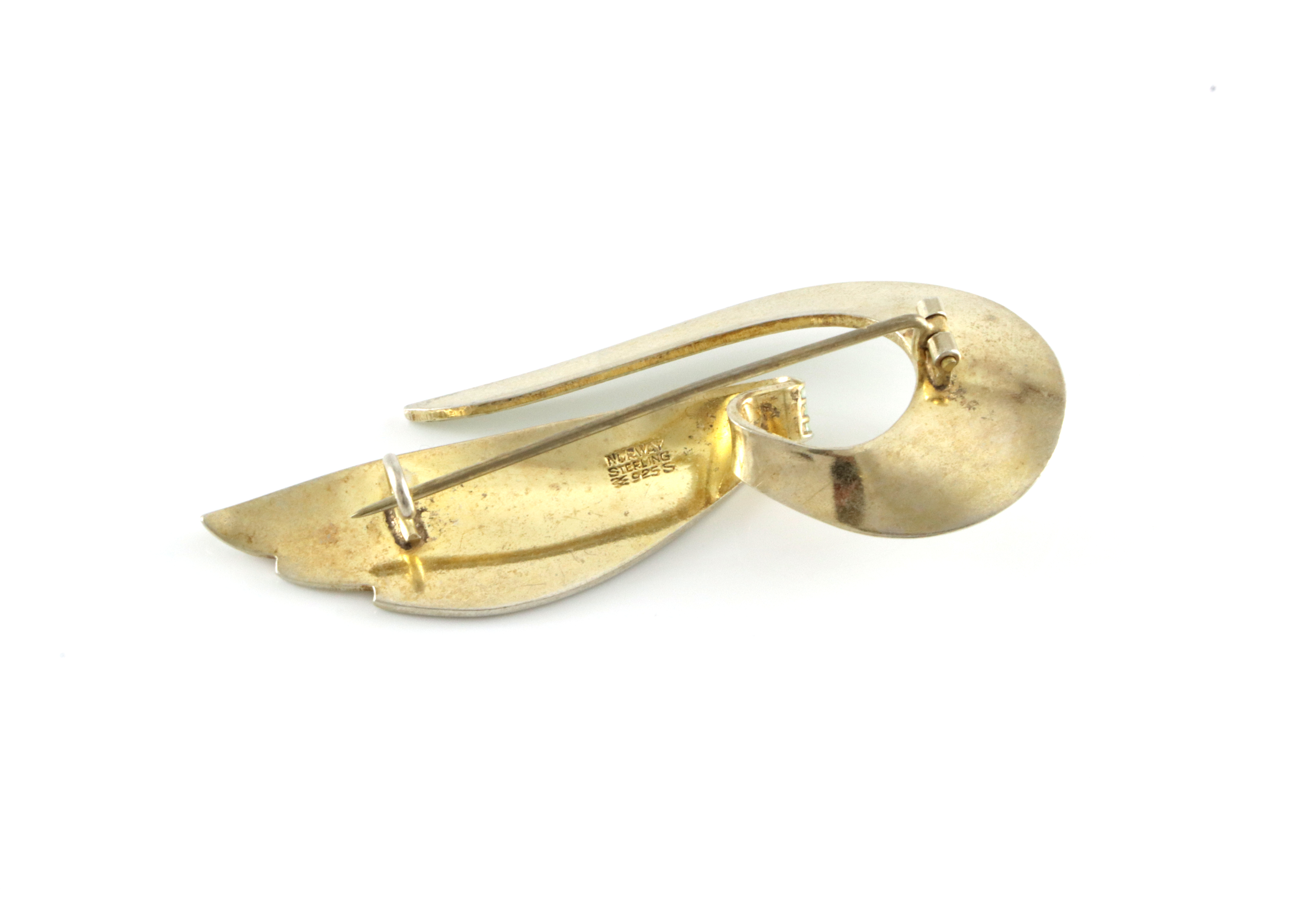 Brosje i forgylt sølv med hvit emalje. Produsert av Aksel Holmsen. 6,4 x 2,5 cm