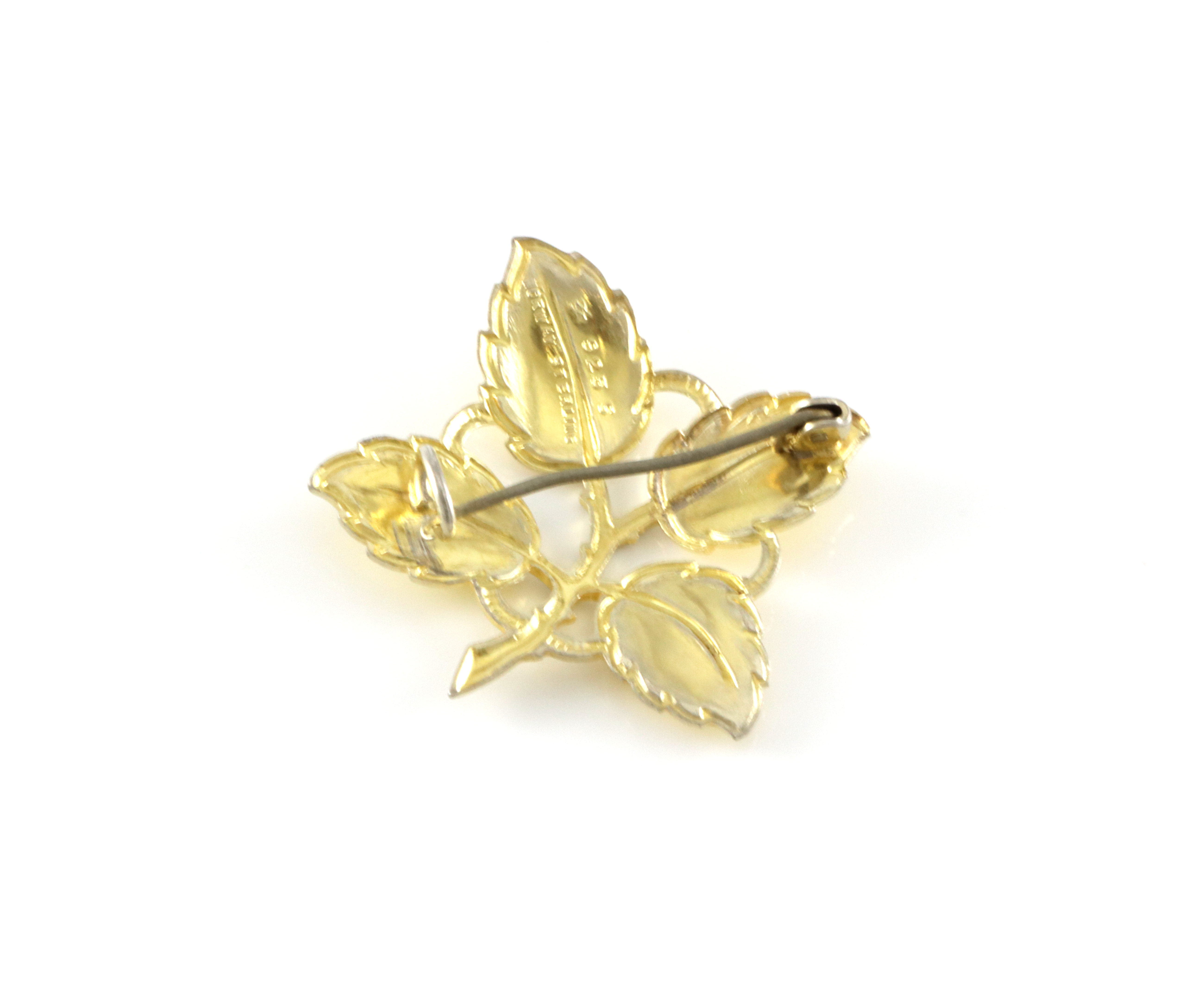 Brosje i forgylt sølv med gul emalje. Produsert av Aksel Holmsen. 3,6 x 3,6 cm