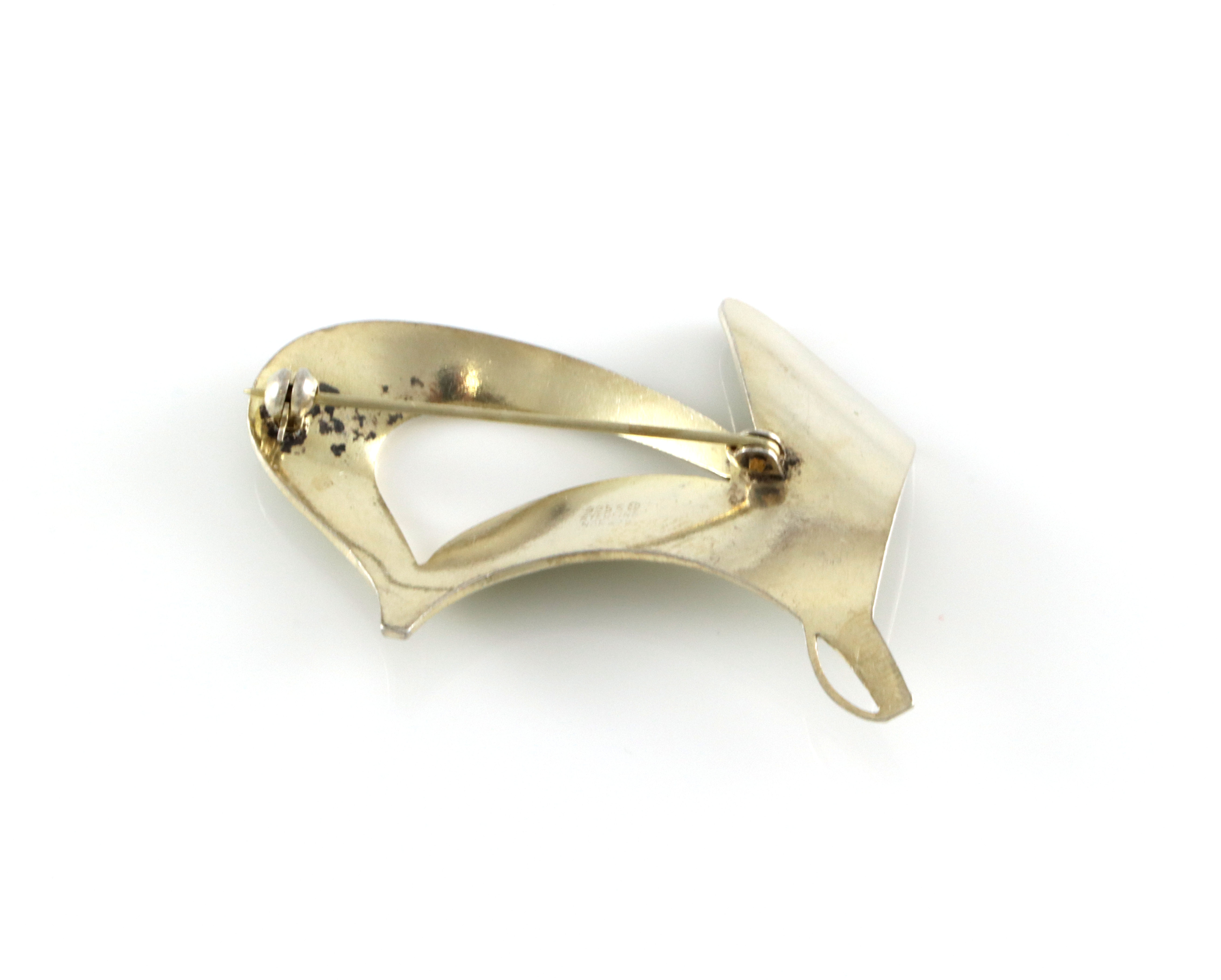 Brosje i forgylt sølv med grønn emalje. Produsert av Ivar T Holth. 5,4 x 4,0 cm