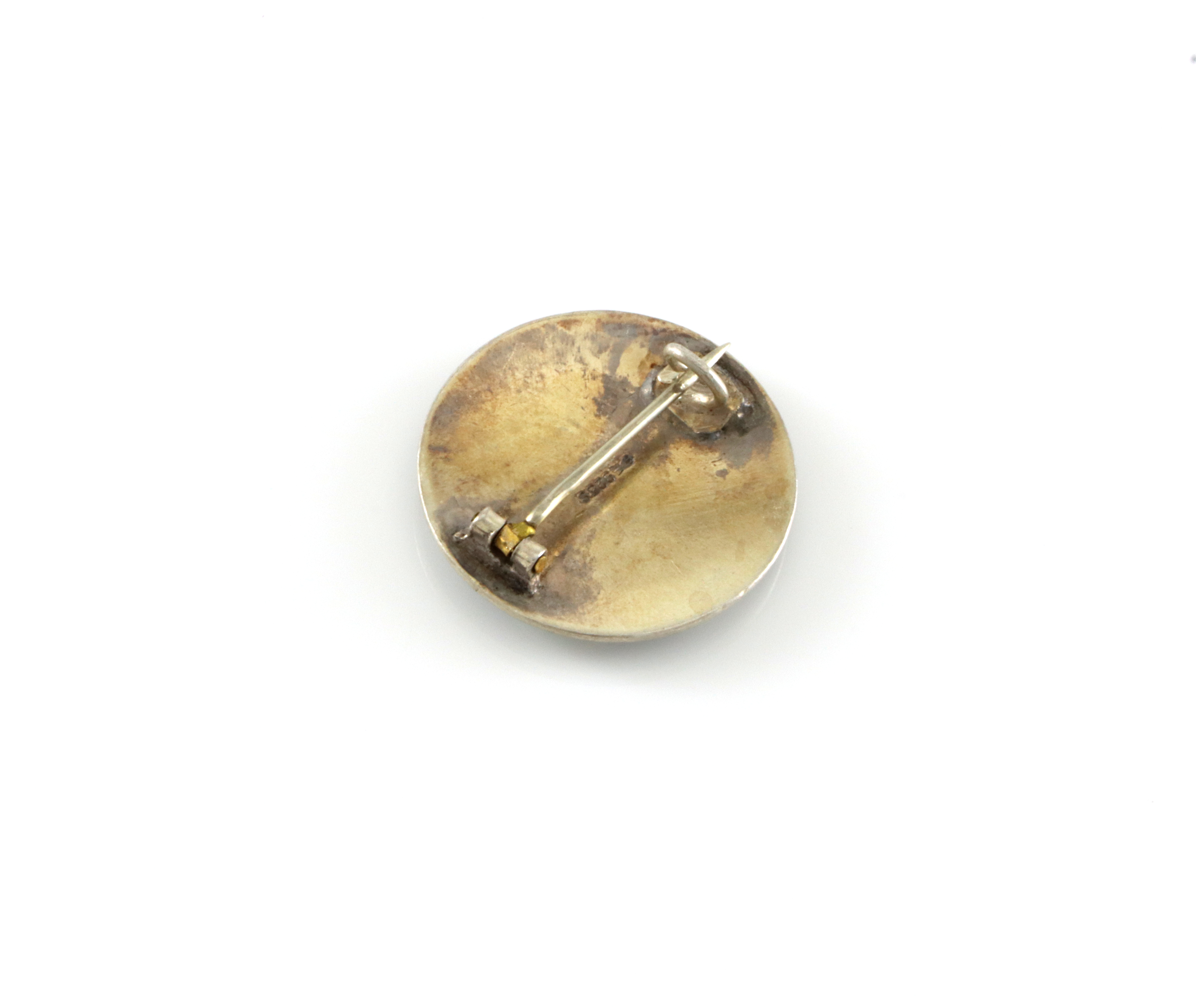 Eldre brosje i forgylt sølv. Rosemotiv, samt hvit og sort emalje. Bruksriper og ørsmå avslag i "glasuren". Byttet nålfeste og noe løs nål.