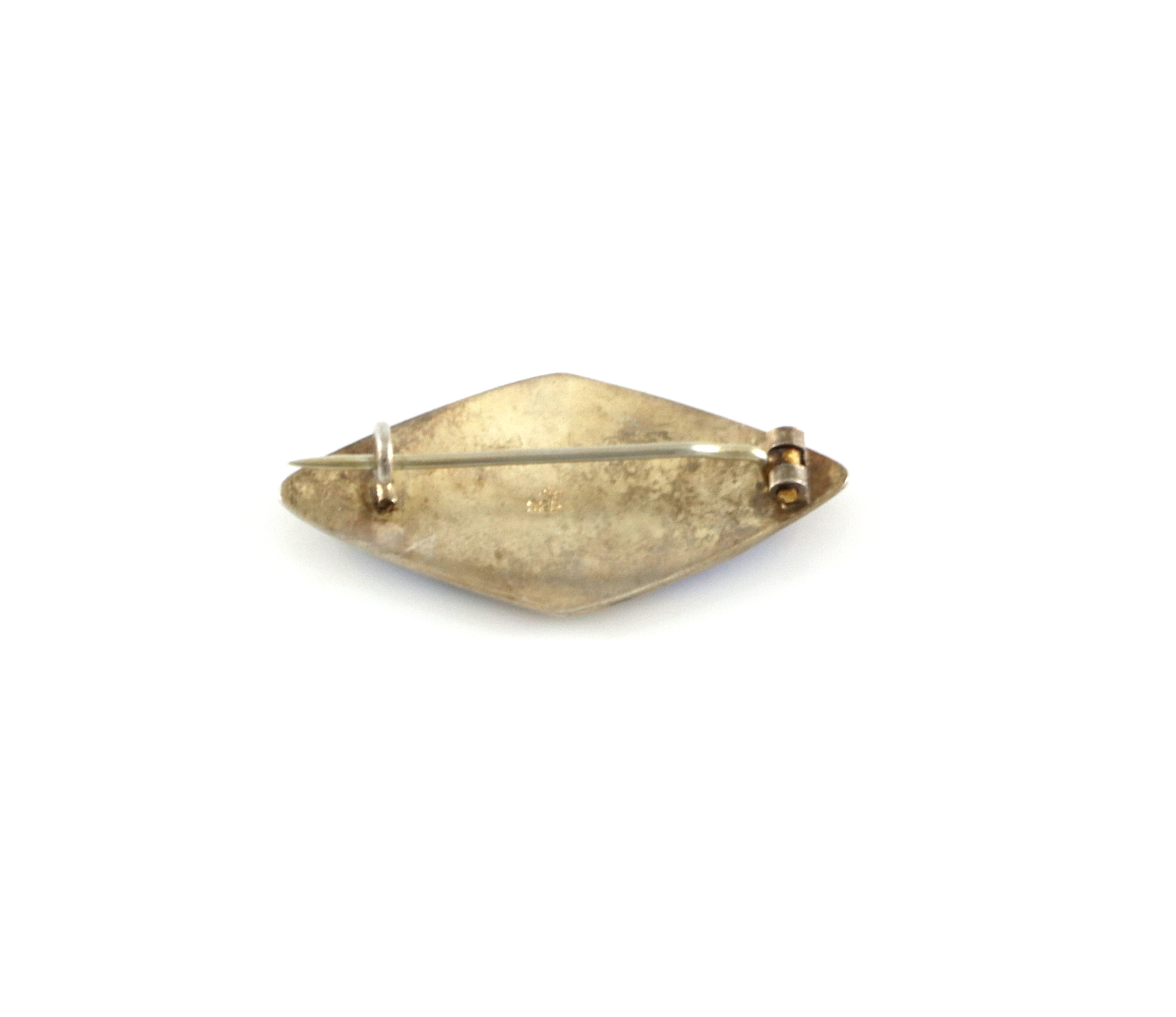 Emaljert brosje i forgylt sølv. Flerfarget emalje, vikingskip i natur. Produsert av Hjortdahl.
