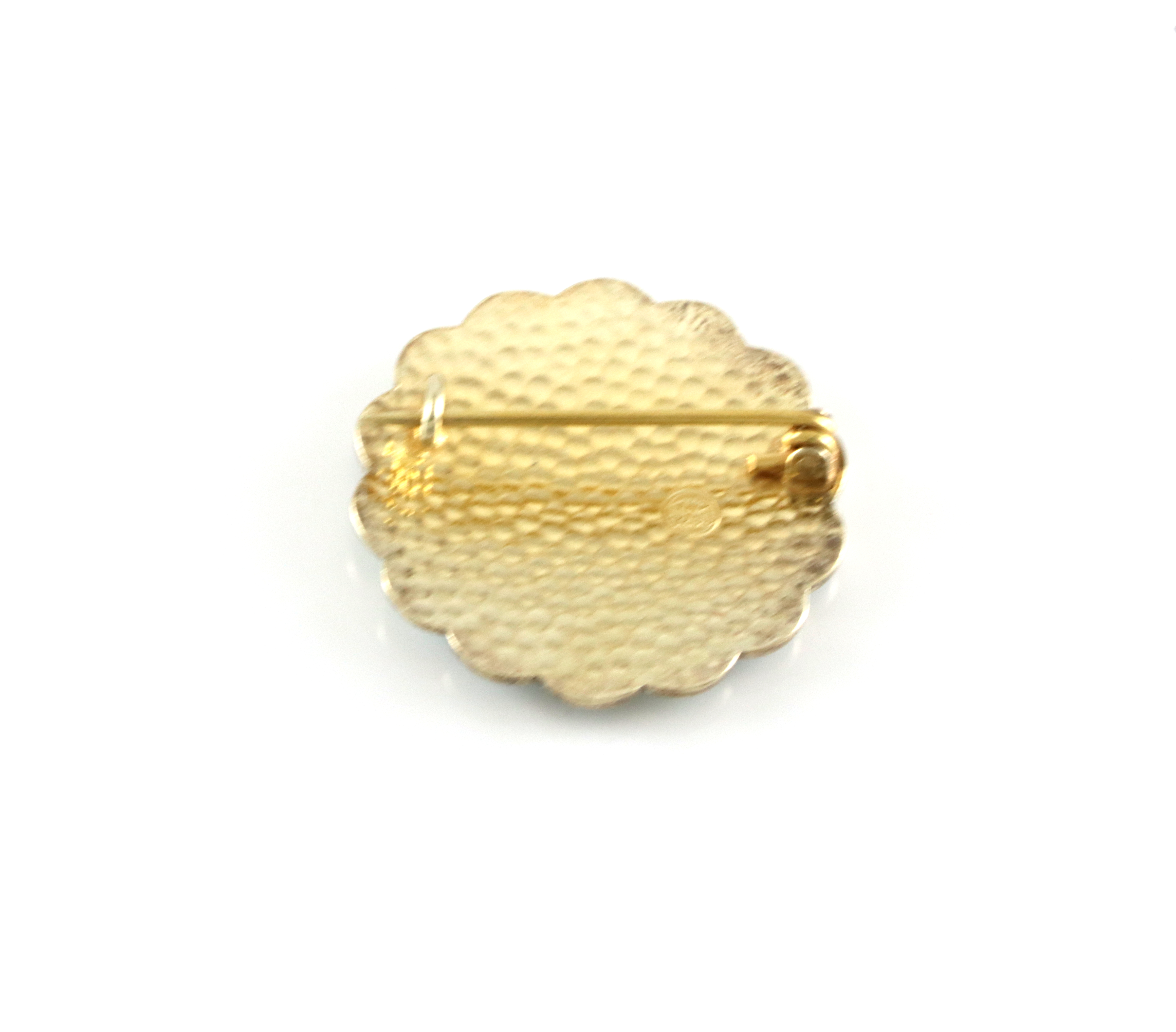 Brosje i forgylt sølv med flerfarget emalje. Blå blomster på hvit bakgrunn. Produsert av Arne Nordlie.