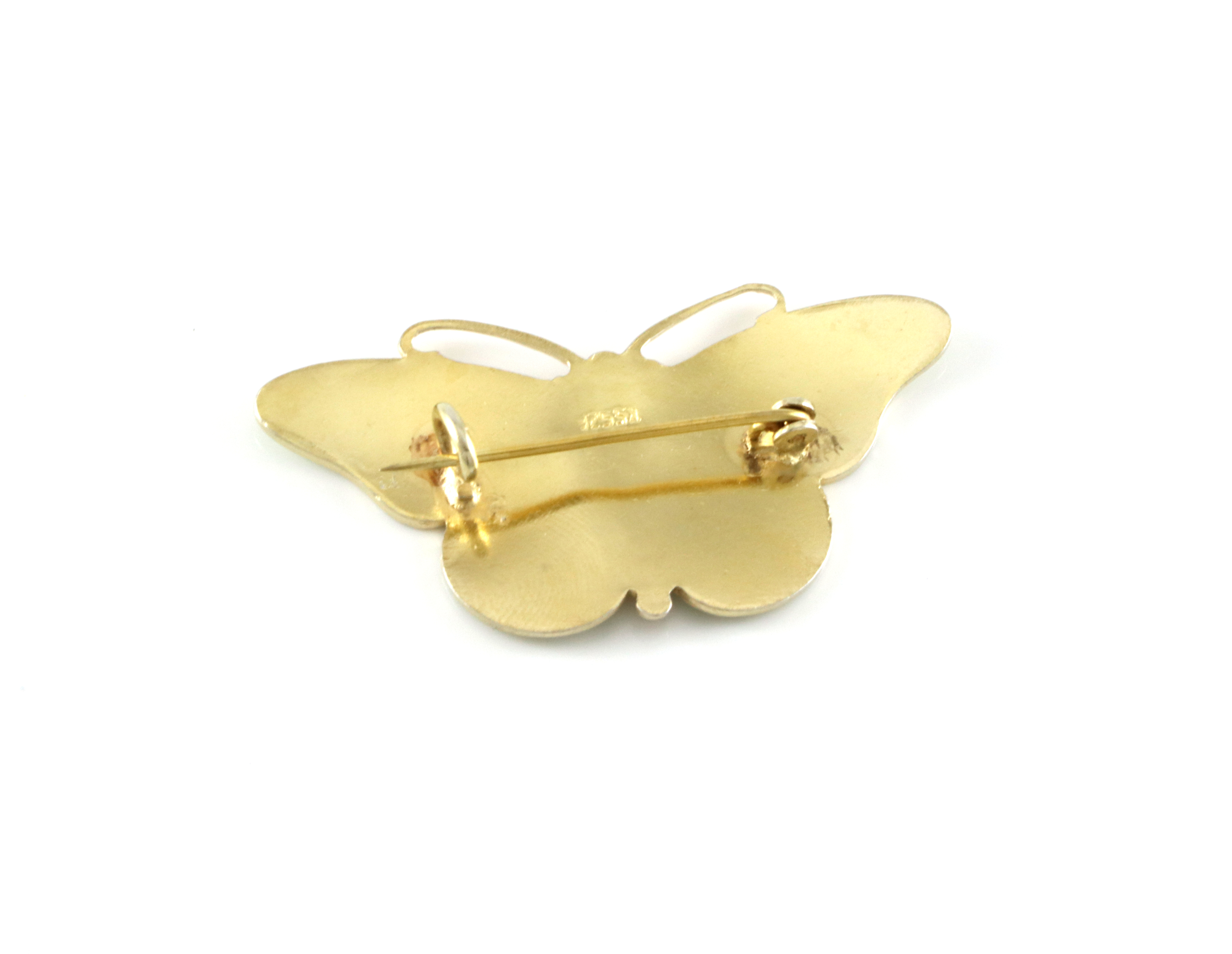 Brosje i forgylt sølv med hvit emalje. Produsert av KS(Kristiansen), uvanlig type/produsent.
