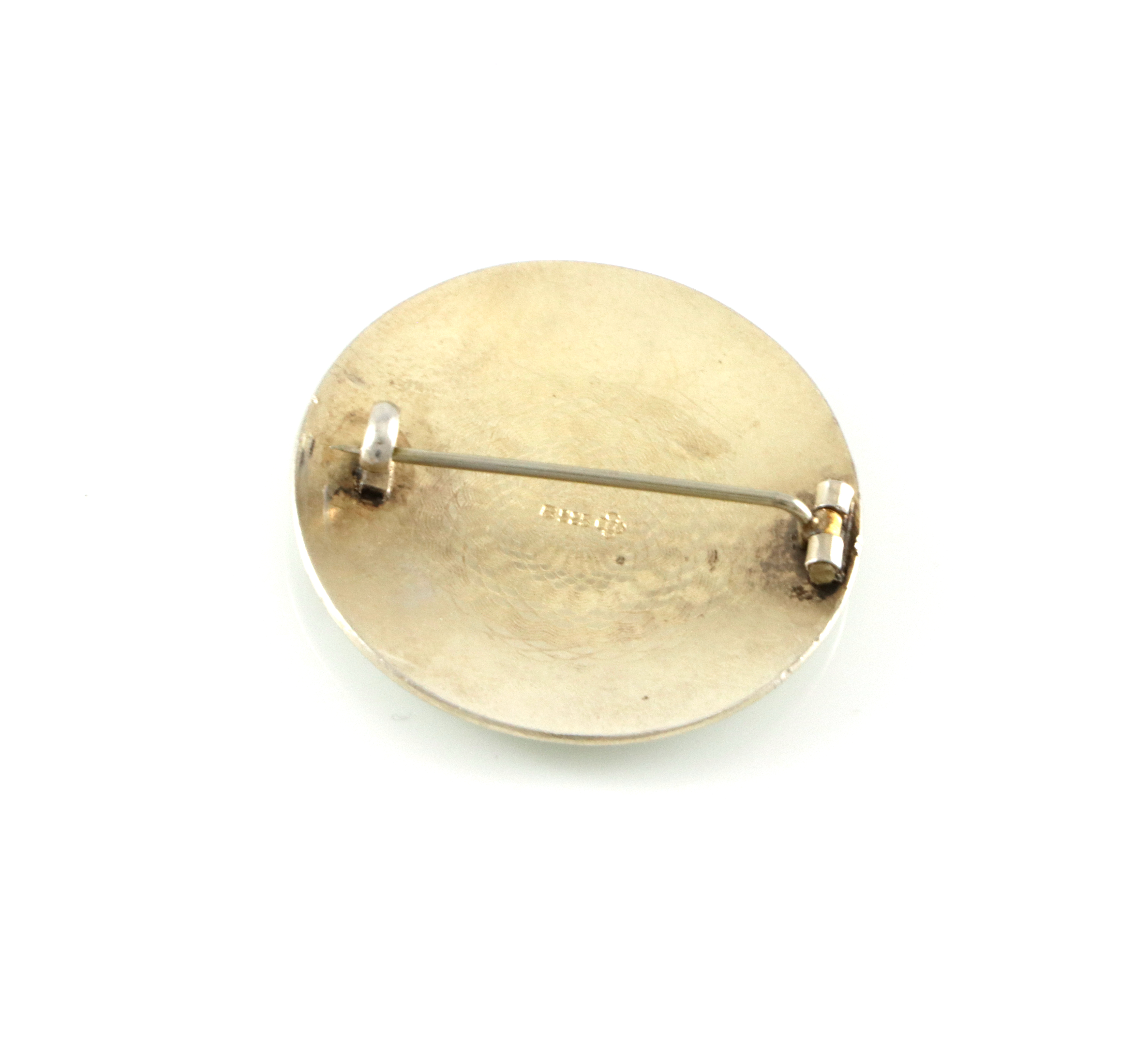 Brosje i forgylt sølv med flerfarget emalje. Motiv av blå blomster på hvit bakgrunn. Produsert av Ole Olberg.