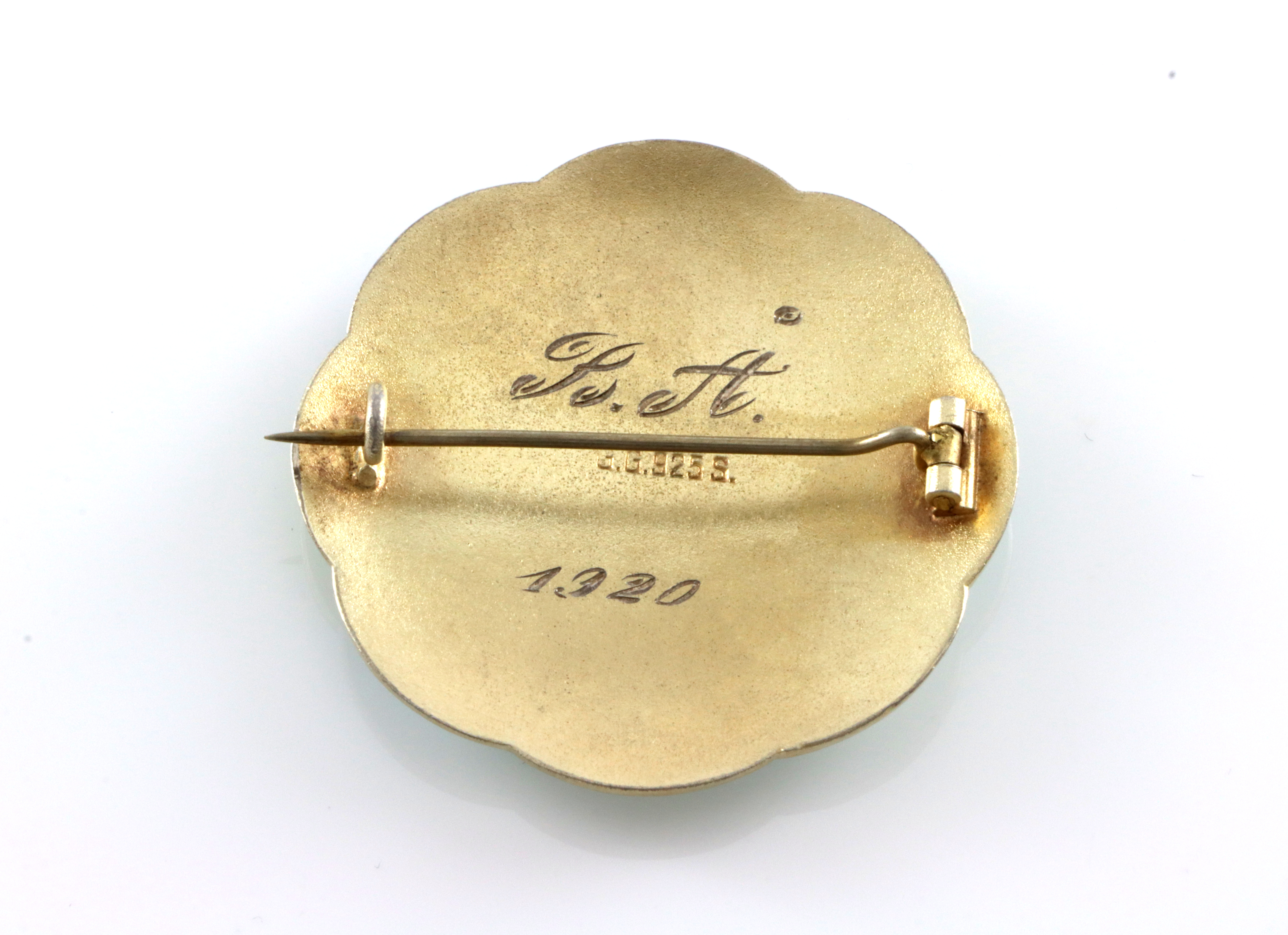 Vakker brosje signert Gustav Gaudernack Diameter: 45 mm Veldig små brune flekker som ligger i emaljen Gravert " B.Å 1920" I god stand