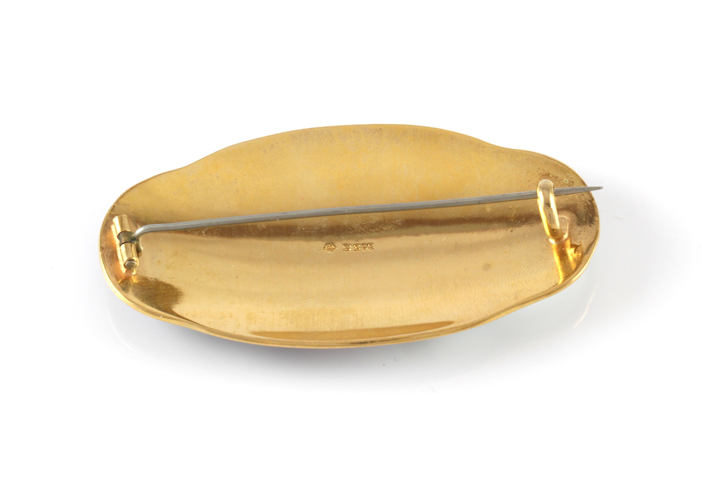 Stor emaljert brosje fra Hjortdahl. Dessverre et ørlite avslag øverst til høyre, så selges til redusert pris. 6,8 x 3,8 cm