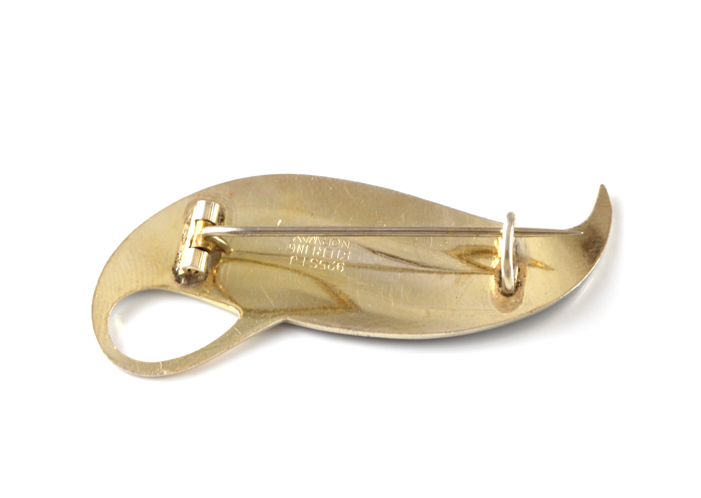 Forgyldt sølv og svart emalje. Mestermerke FJ, som trolig er Finn Jensen. 5,3 x 2,1 cm