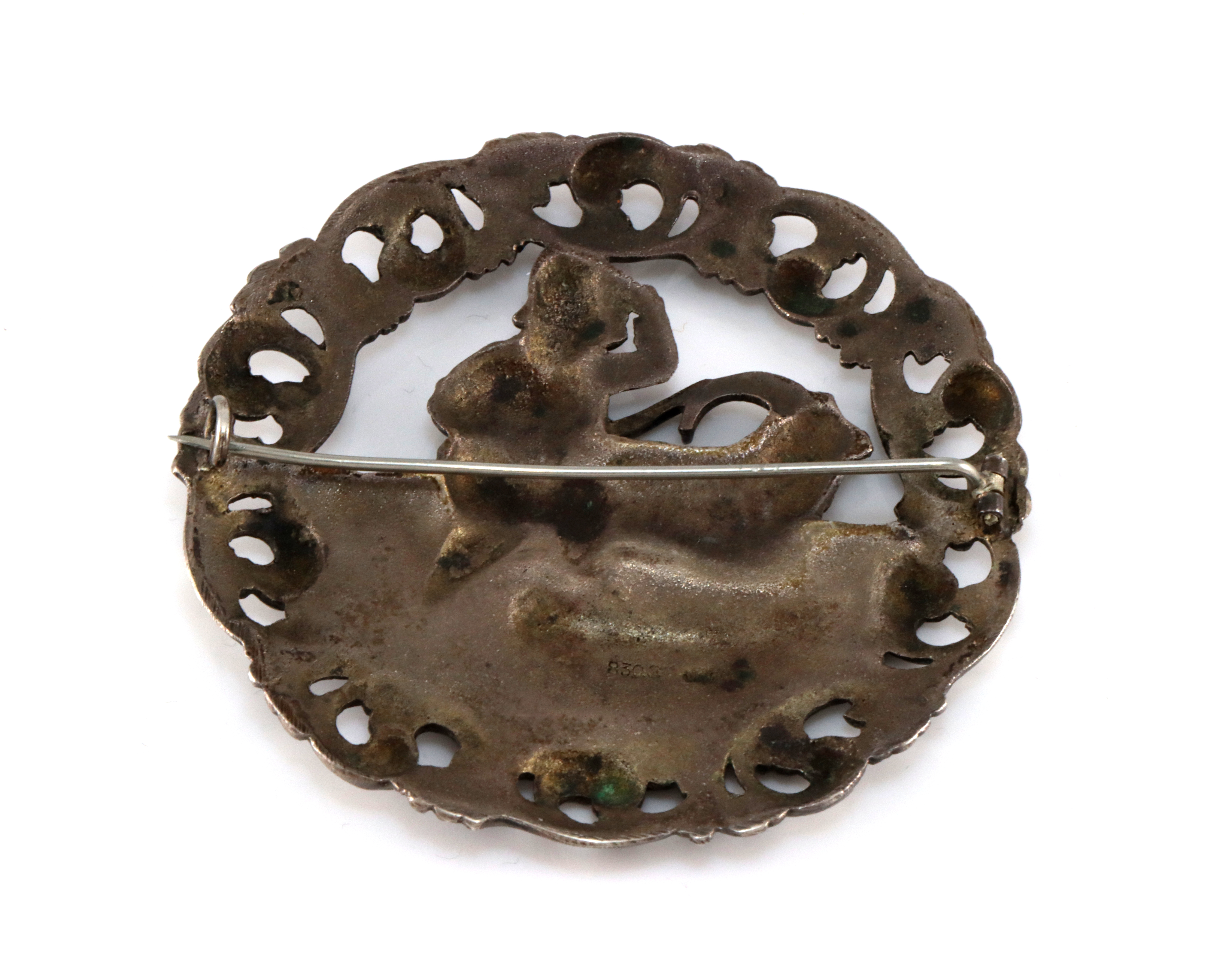 Flott nasjonalromantisk brosje med motiv av Nils og blåmann. Orginale fester bak men noe løs nål.