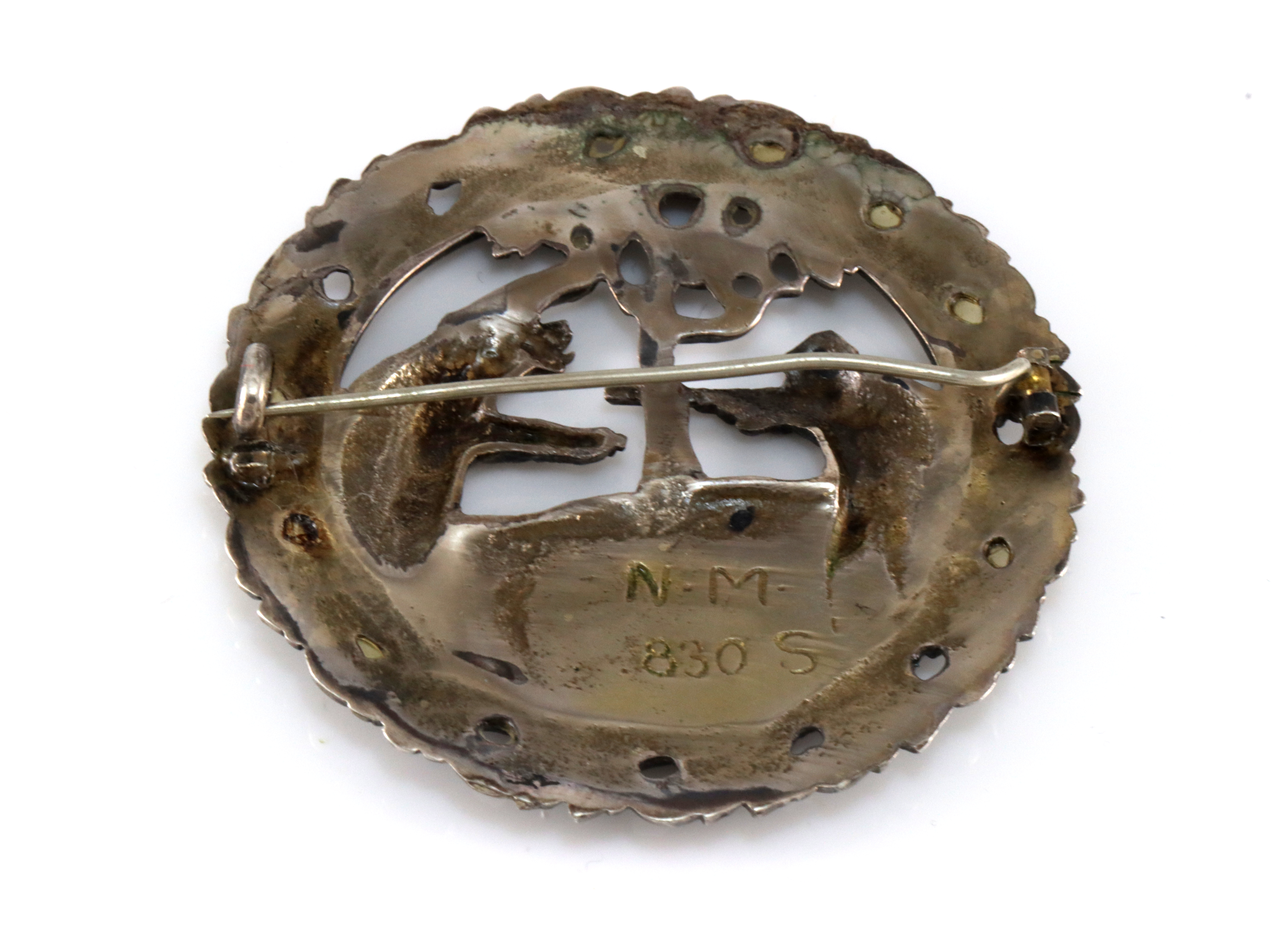 Flott nasjonalromantisk brosje med motiv av jeger, hund og bjørn. Flott jaktmotiv. Brosjen har et snev løs nål.