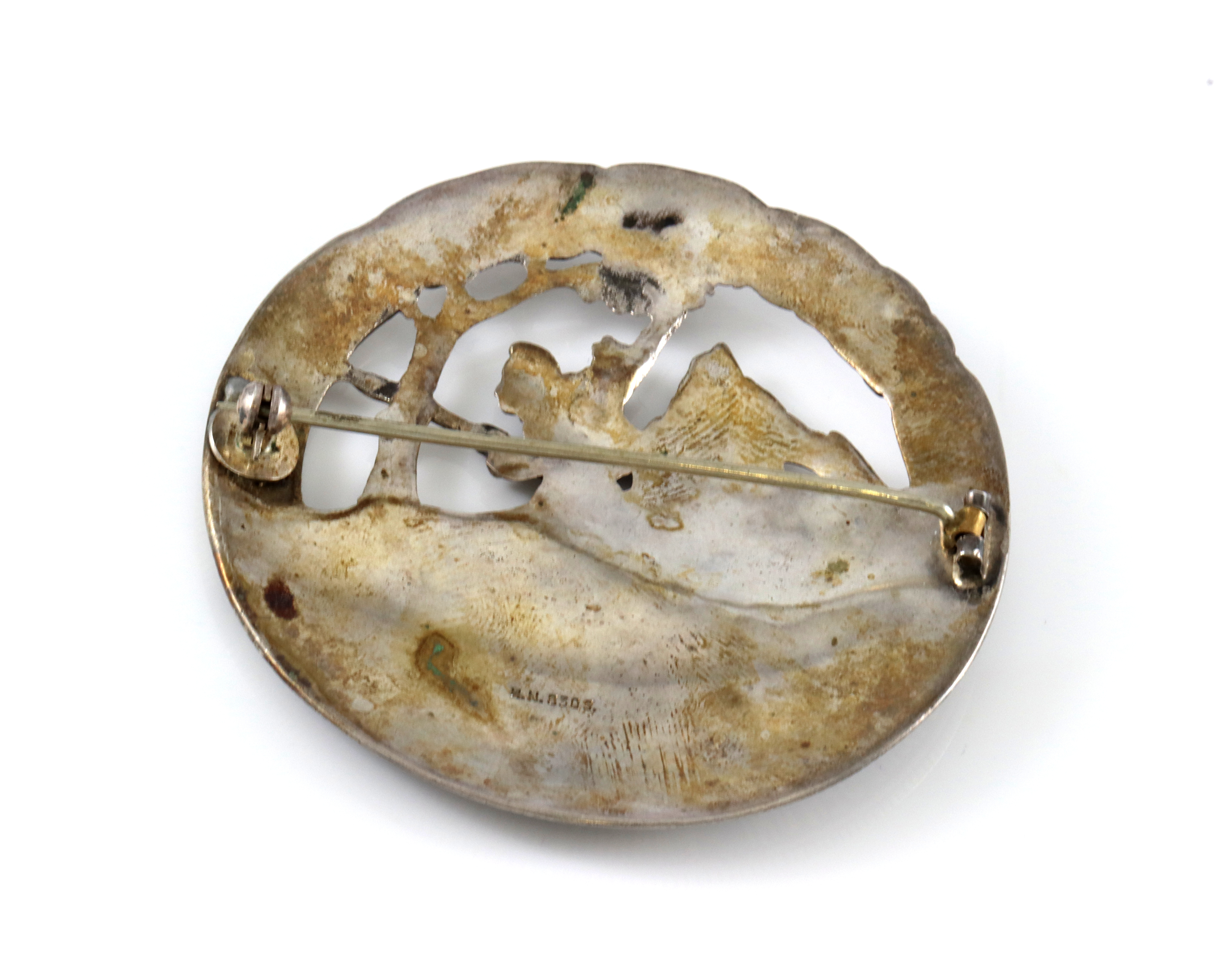 Brosje i sølv med motiv av birkebeinerne. Sekundert og mer moderne nålfeste.