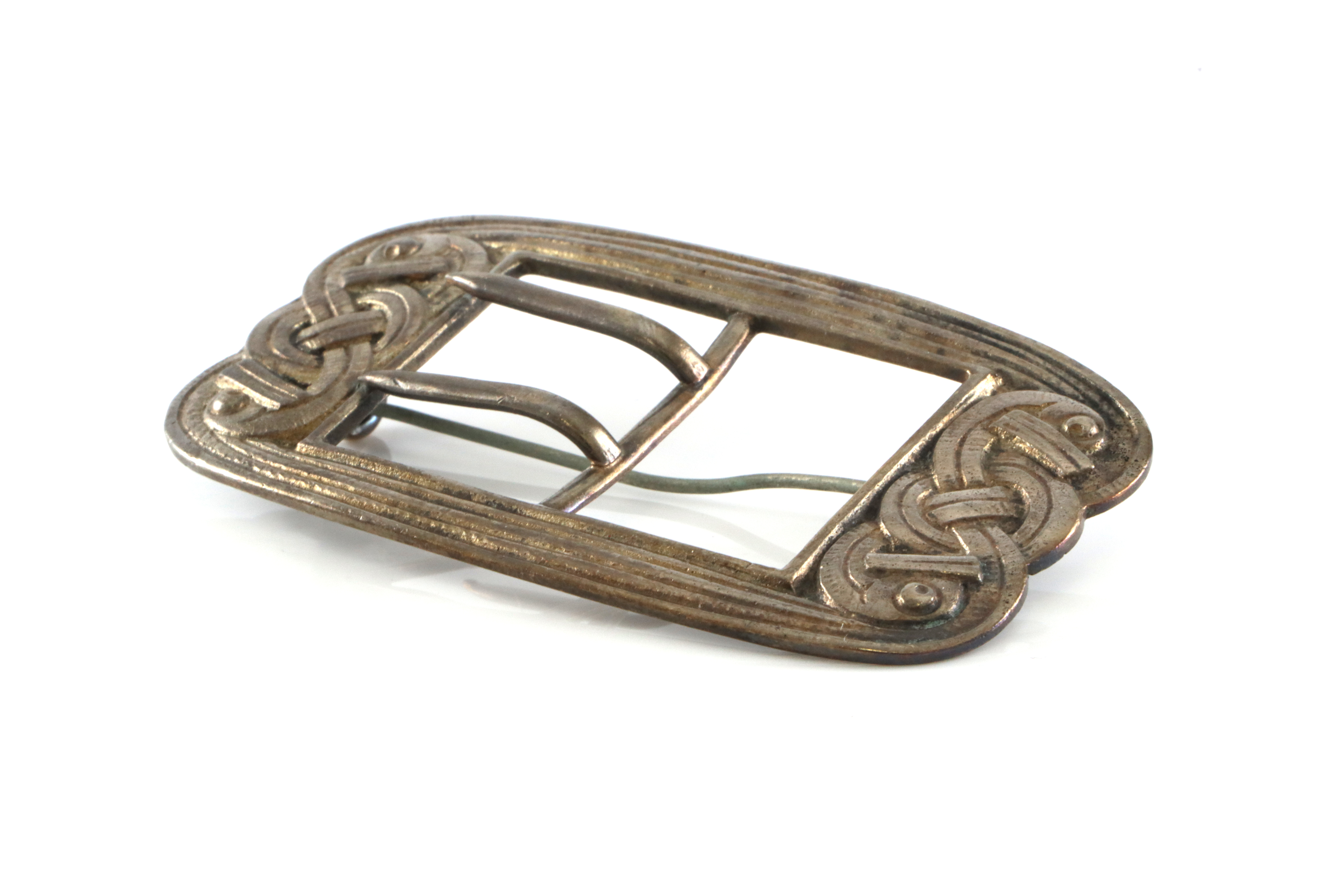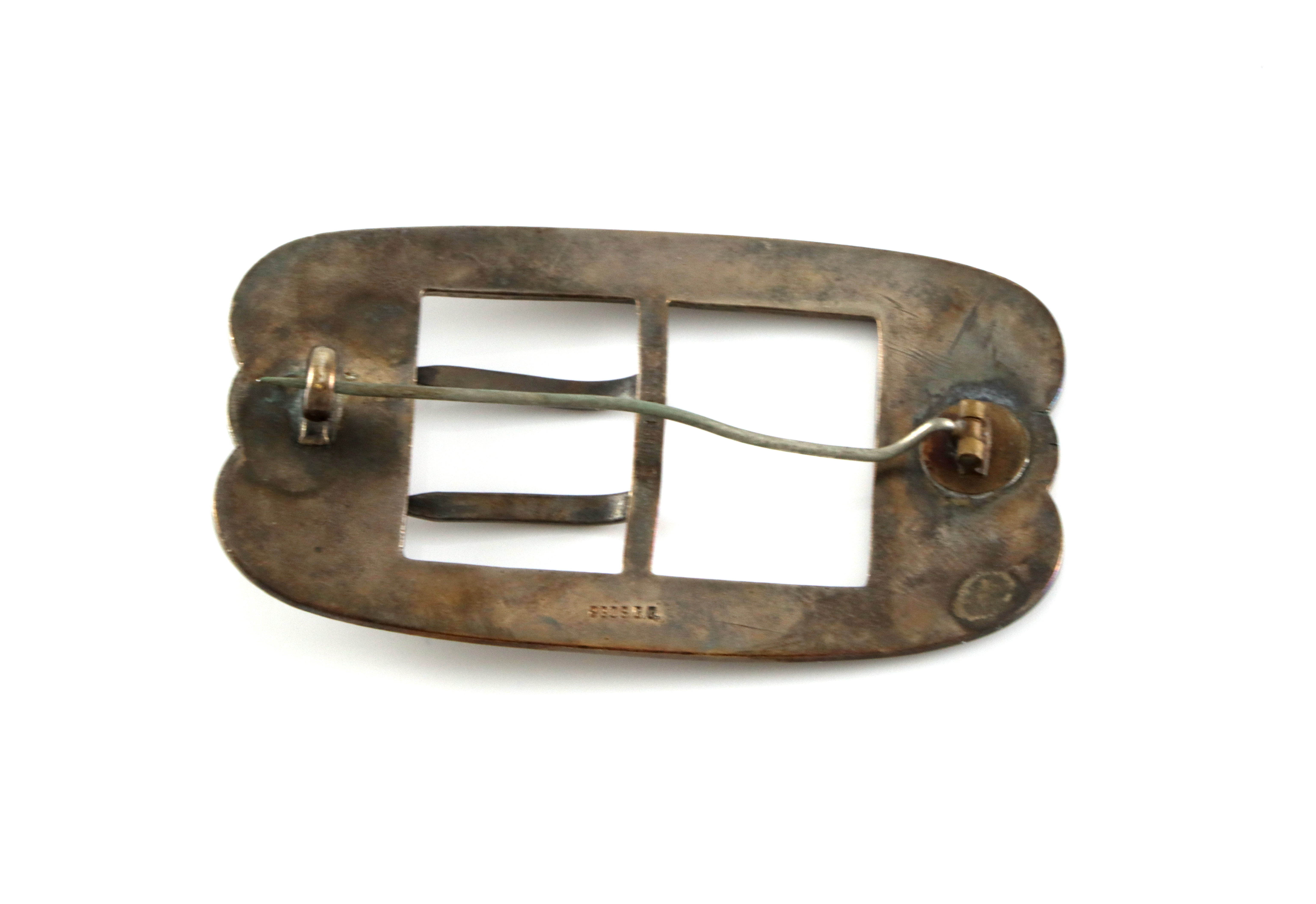 Det er mulig dette har vært en spenne som er omgjort til en brosje i ettertid Mål: 65 x 35 mm Produsent: Gustav Gaudernack Noe bøyd nål