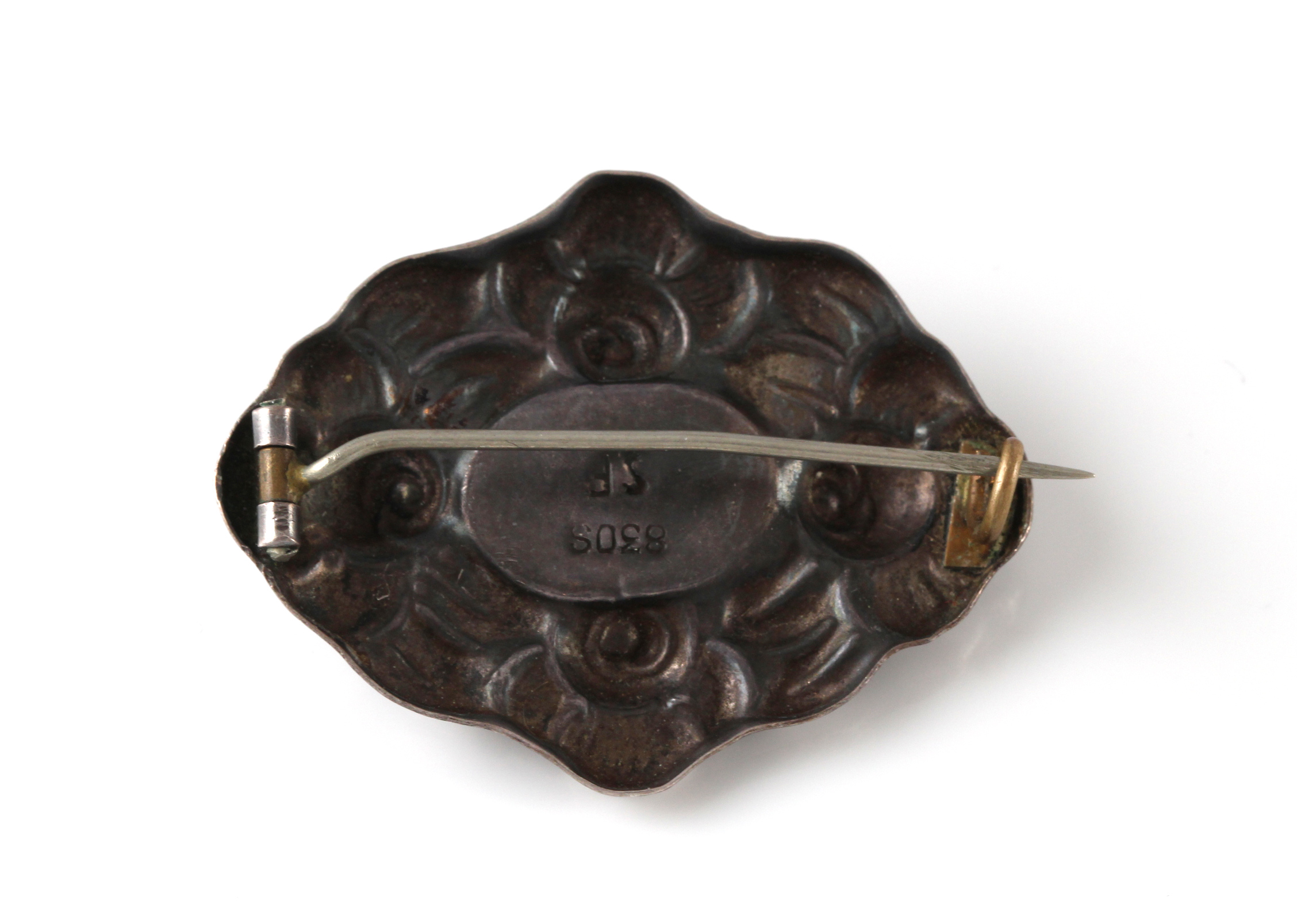 Mål:3,9 x 3,1 cm Produsent: Ukjent mester Rav Nålfeste er trolig sekundært.