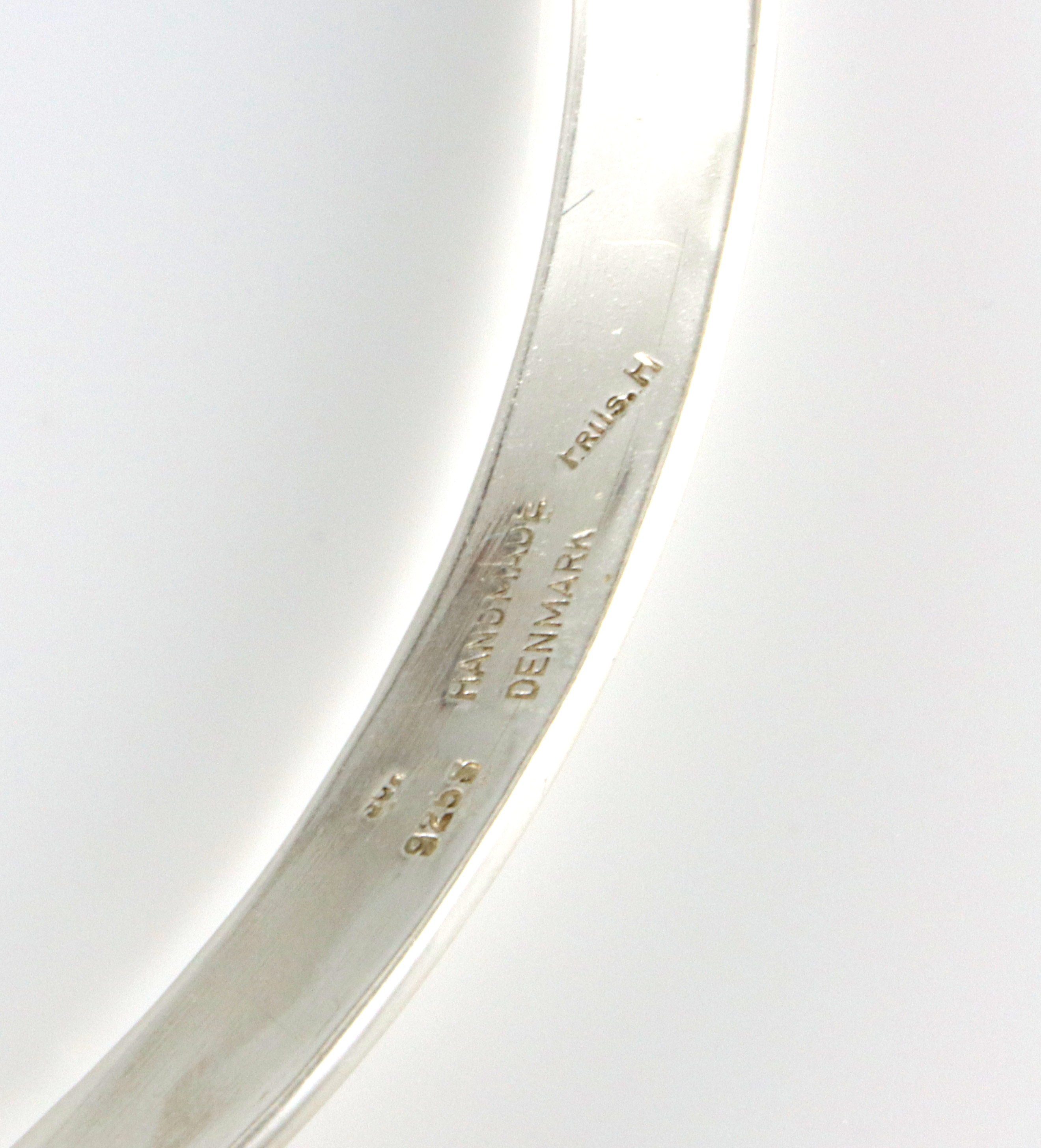 Klarer ikke helt å tyde mesterstempelet på denne. Men er stemplet Handmade Denmark. Bredde: 7 mm Innvendige mål: 12 x 10,8 cm Produsent: ?