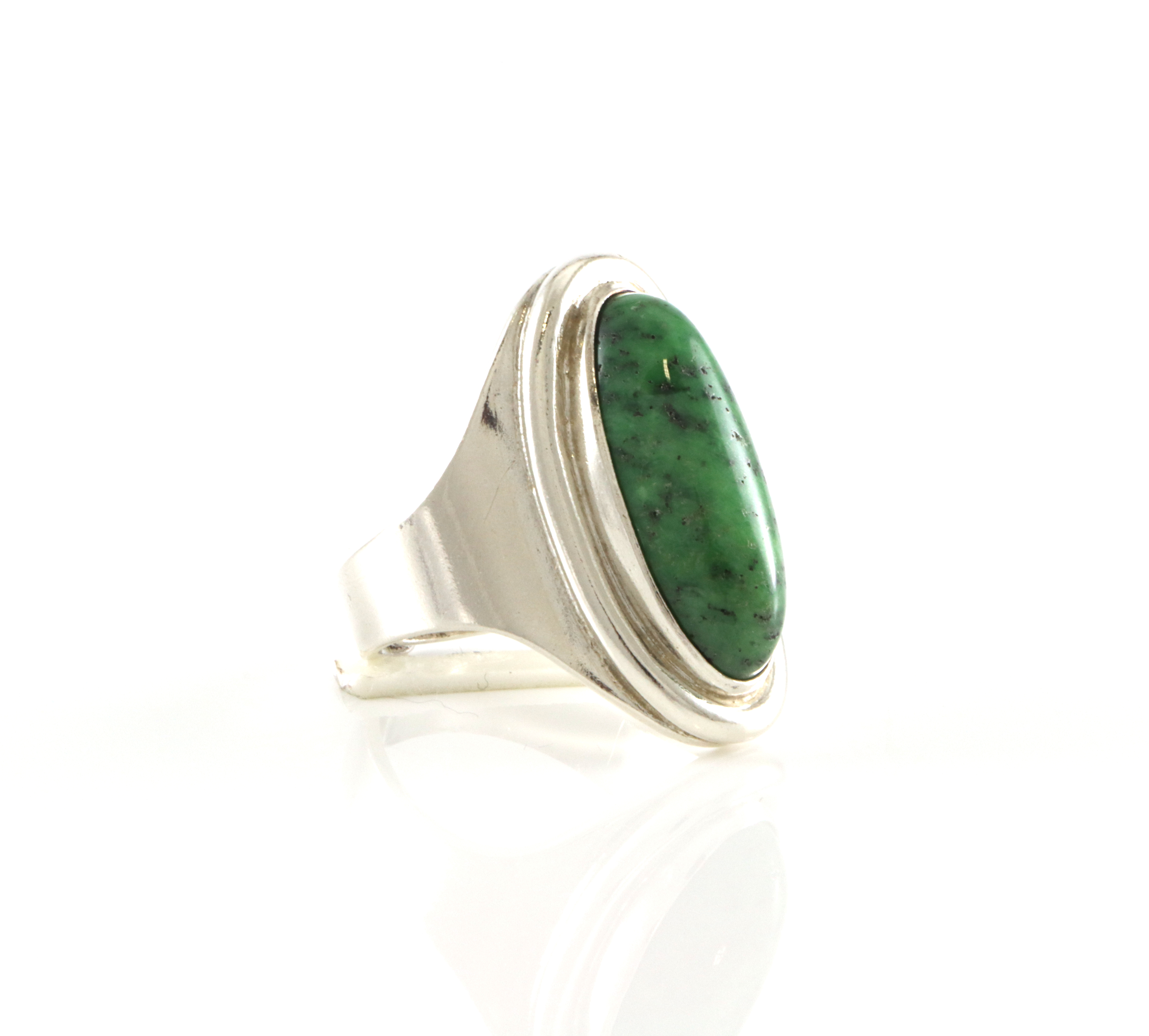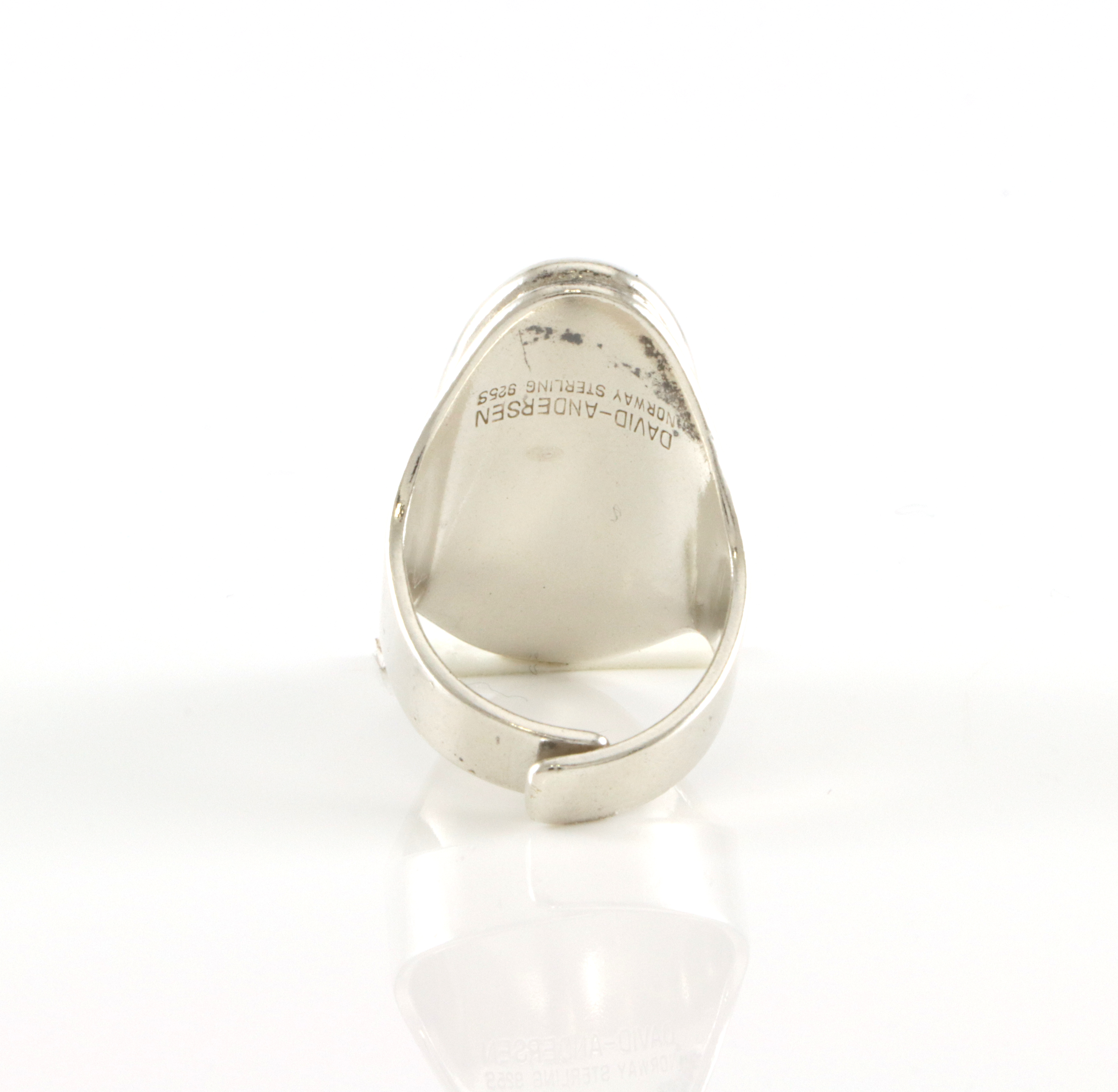 Ring i sølv med grønn stein med svarte prikker Produsert av David-Andersen Ringstørrelse 54 Justerbar skinne, noe urund fra sist justering.
