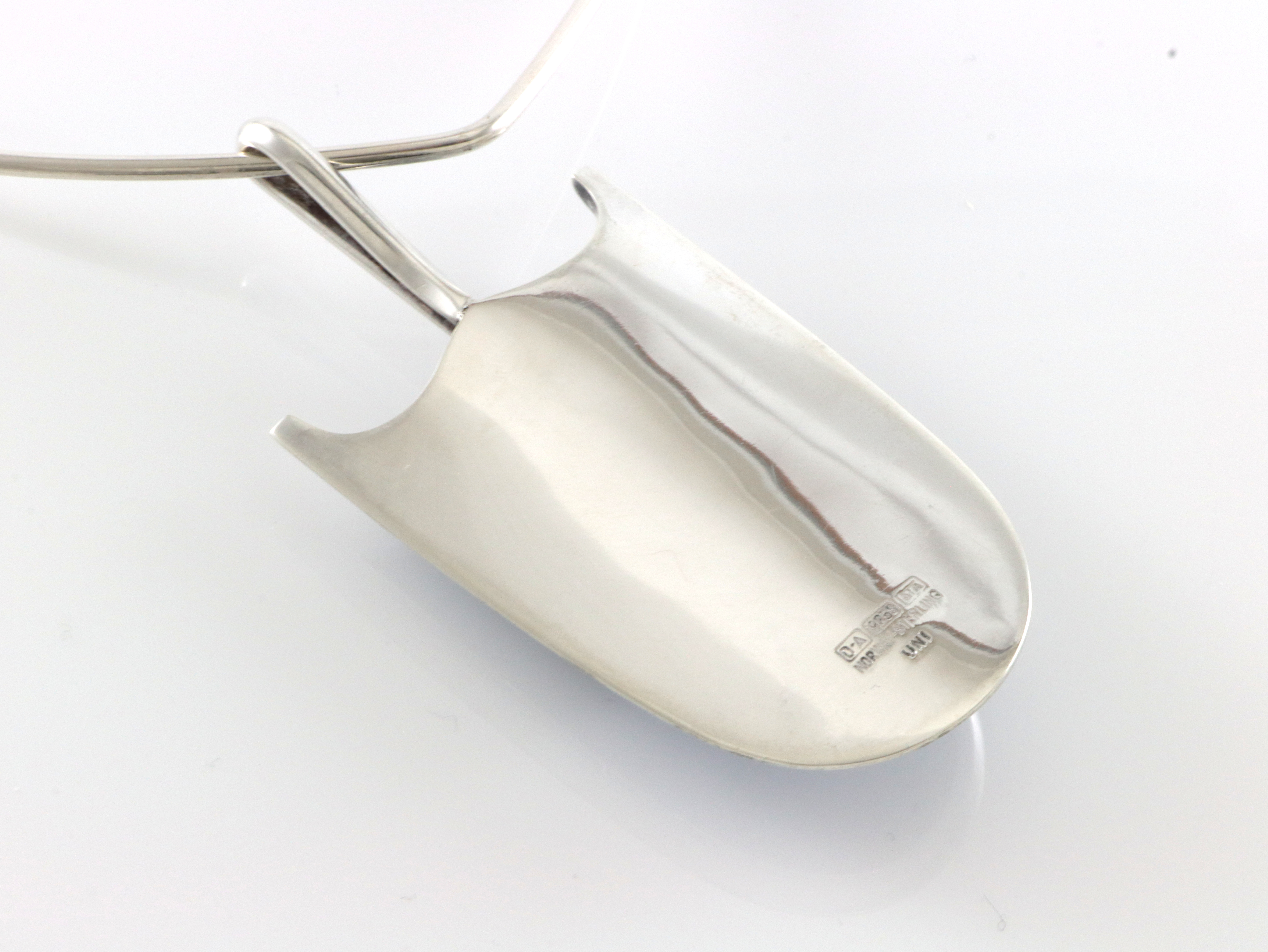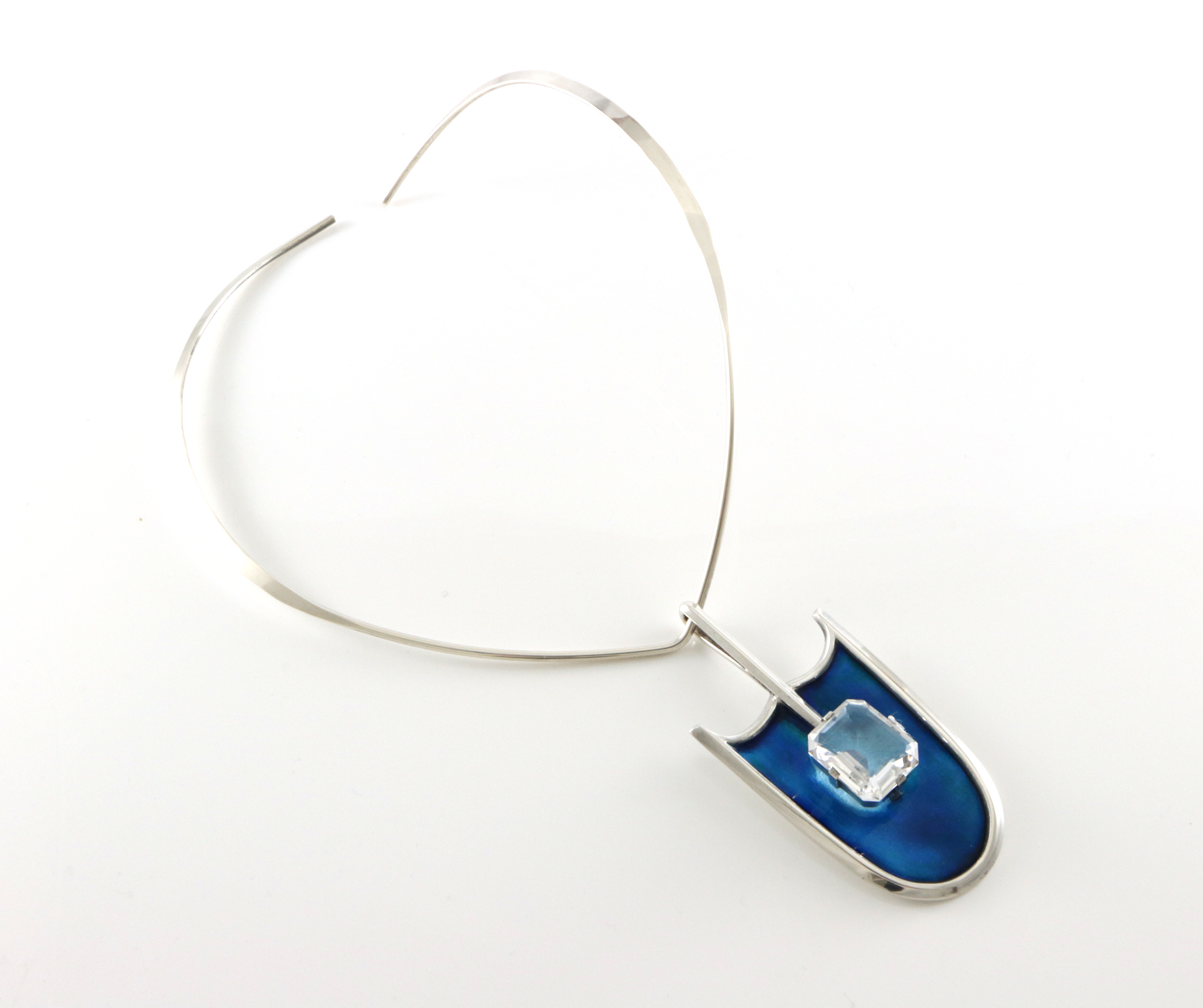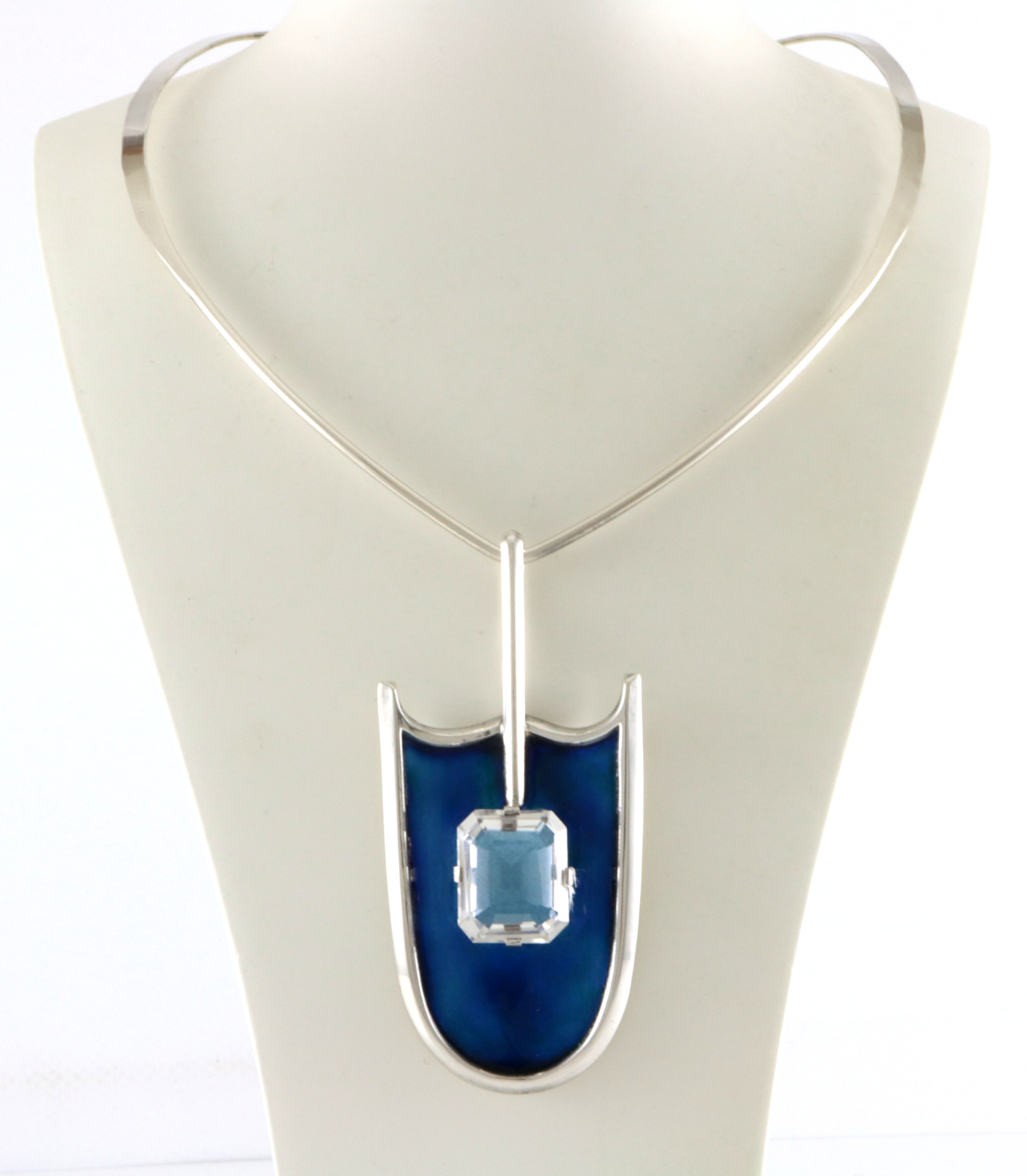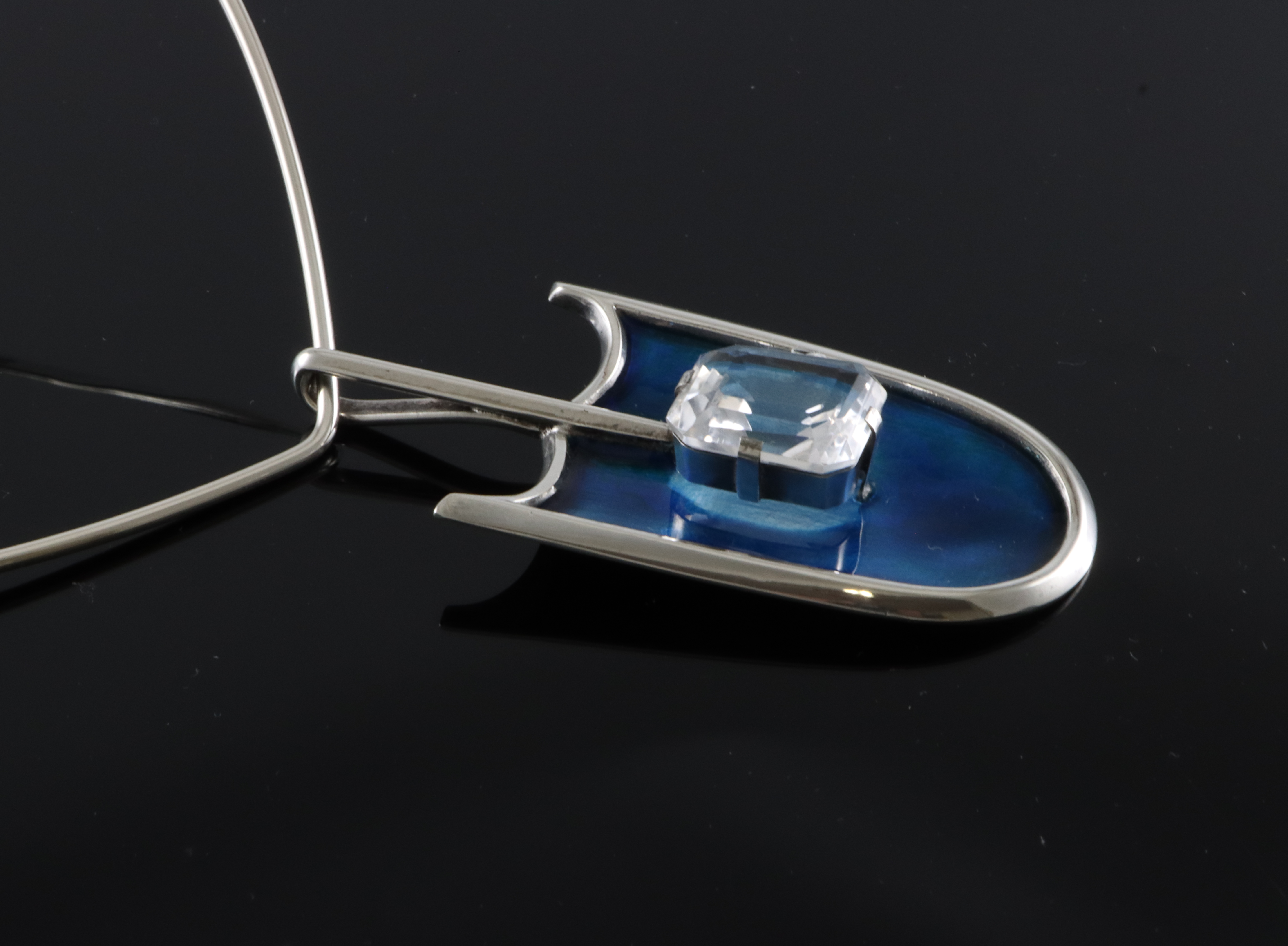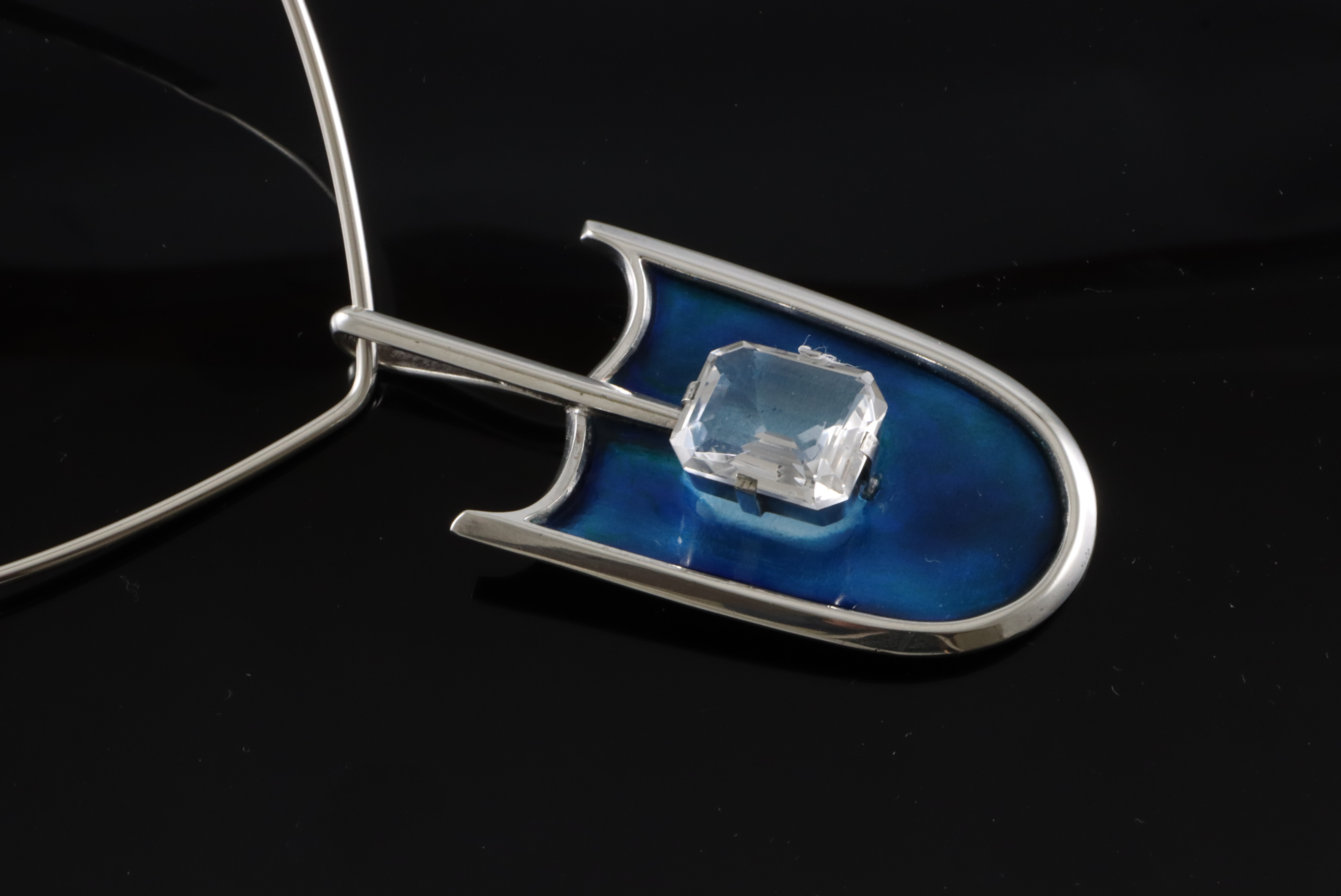 Marianne Berg for Uni David-Andersen. "Trollspeil" anheng i 925 Sølv med blå emalje og bergkrystall satt på klave i 925 Sølv. Str anheng: 75 x 34 mm Str klave: 13 x 10,7 cm Anheng og klave fremstår som tilnærmet ubrukt Steinen "skrangler", dvs er noe løs. Mht anhengets tilstand så kan det tyde på at det stammer fra produksjonen