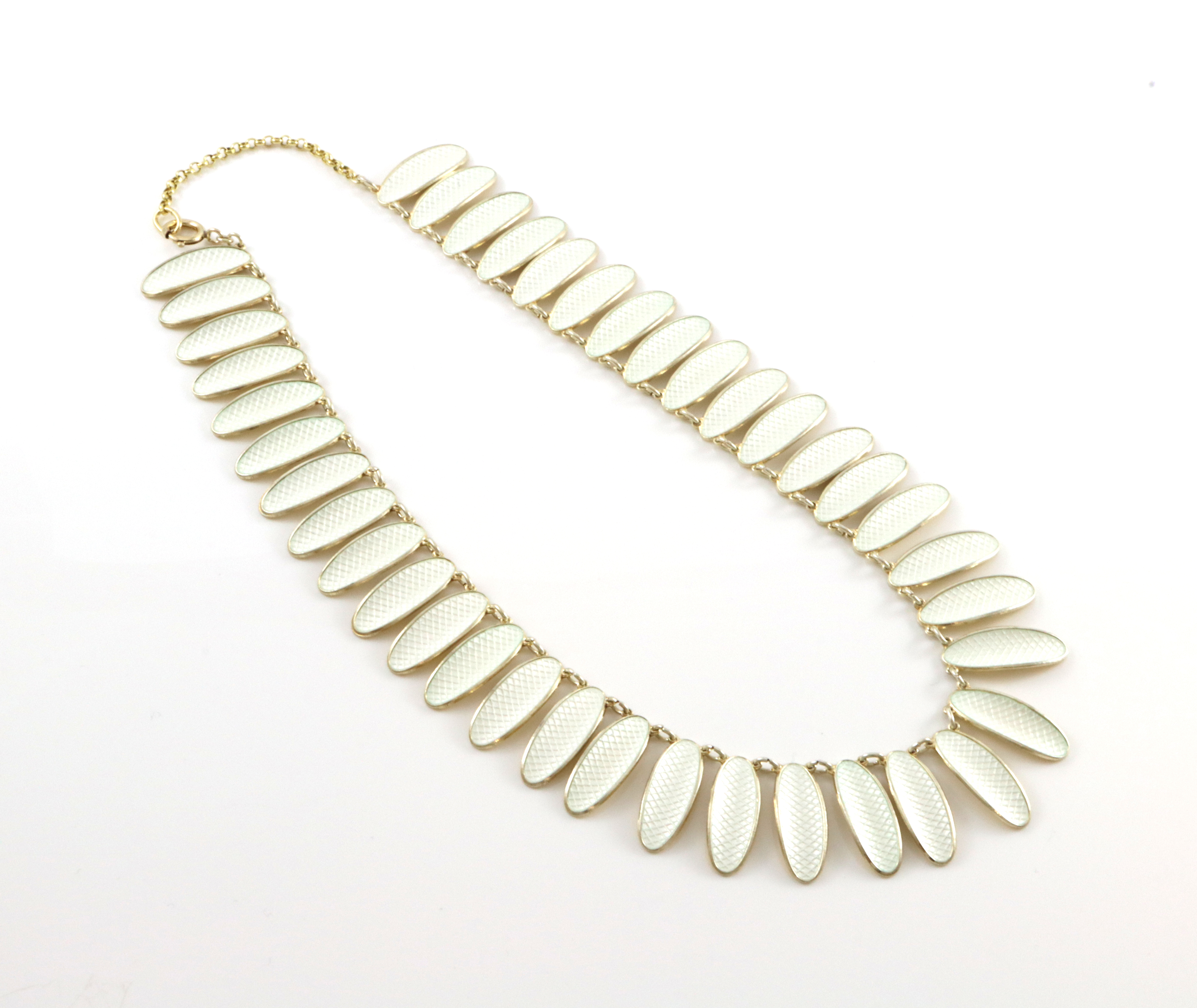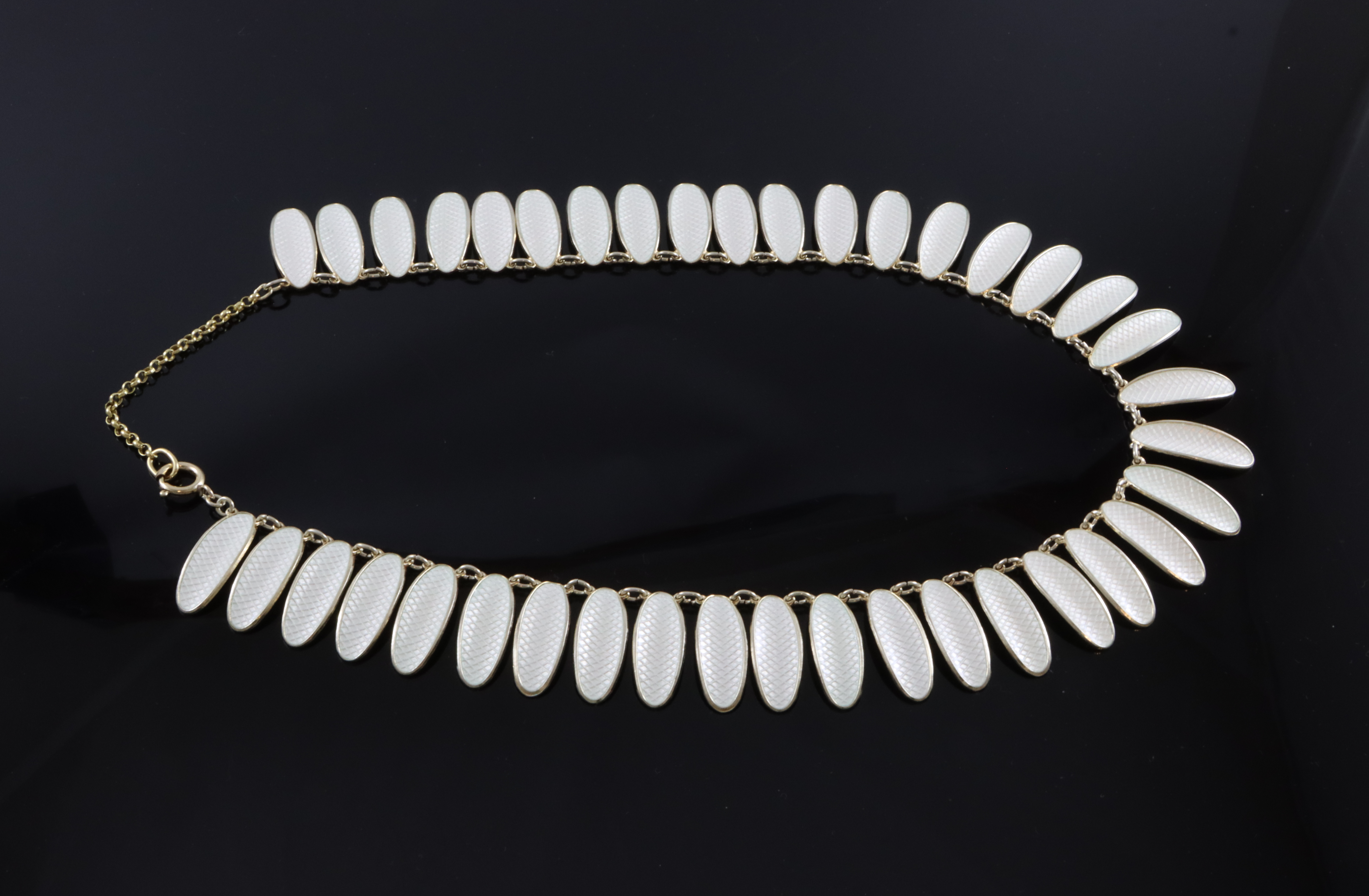 Griselekkert collier i 925 S og emalje signert Willy Winnæss Bredde: 24 mm Lengde: 46 cm Forlenget med en lenke på 6 cm (den kan enkelt fjernes) I god stand