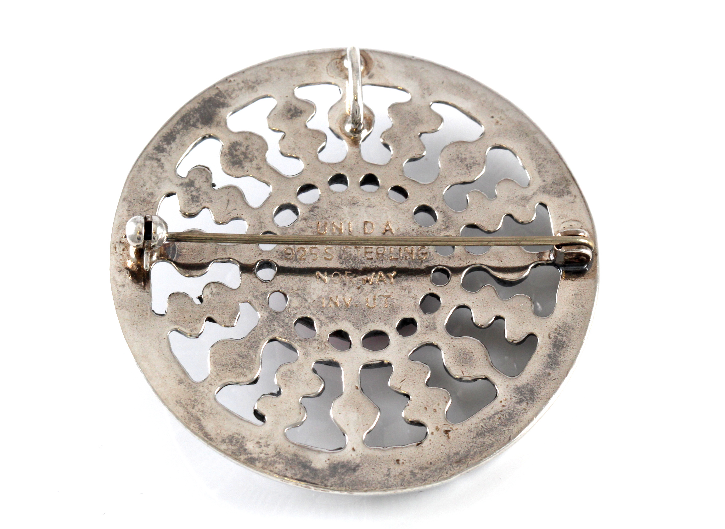 Kombinert brosje og anheng, designet av Unn Tangerud for UNI David-Andersen. Steinen er en thulitt.