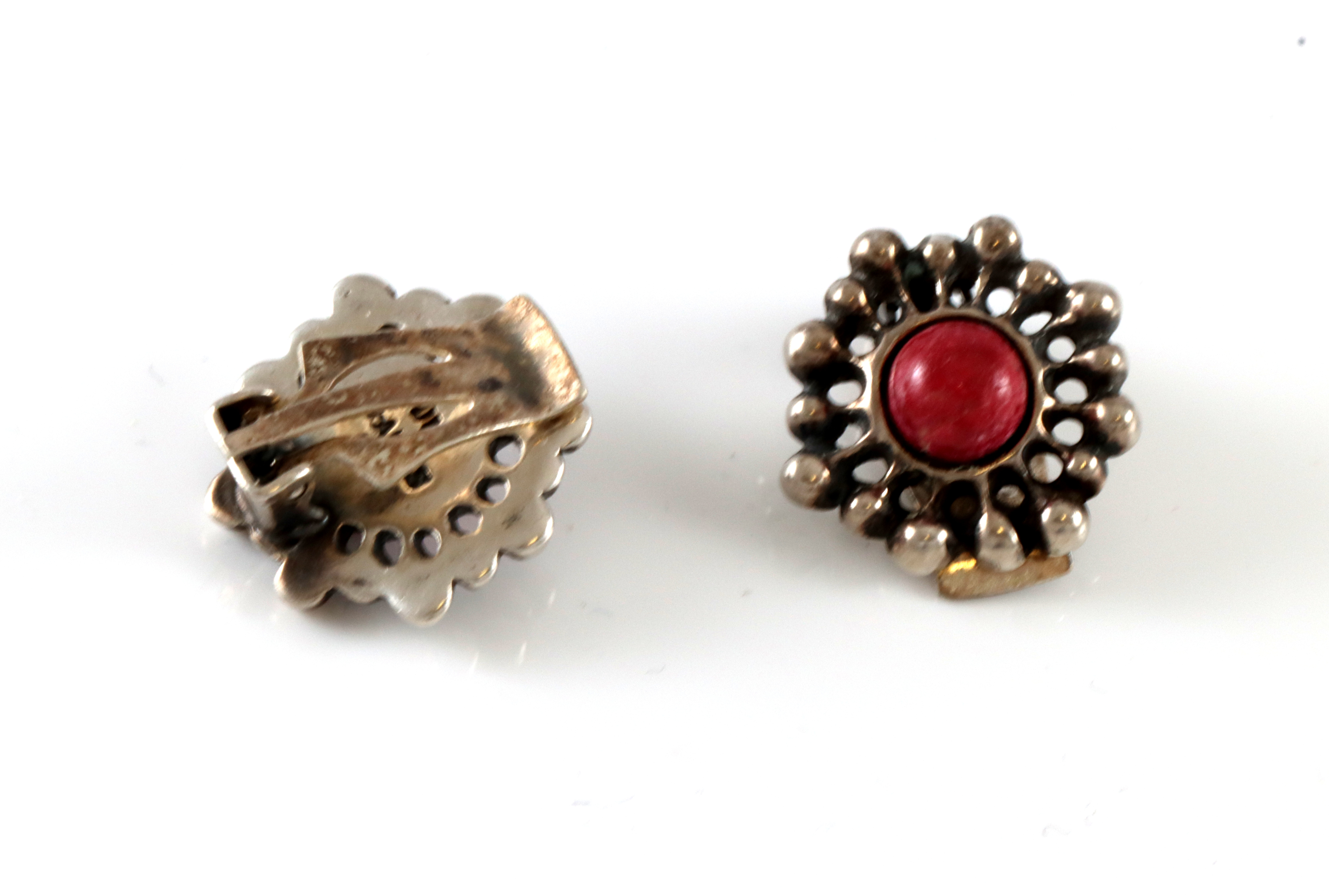 Ørepynt i sølv med klips. Produsert av David-Andersen, designet av Unn Tangerud. Steinen er en thulitt (Norges nasjonalsten). 1,9 x 1,9 cm