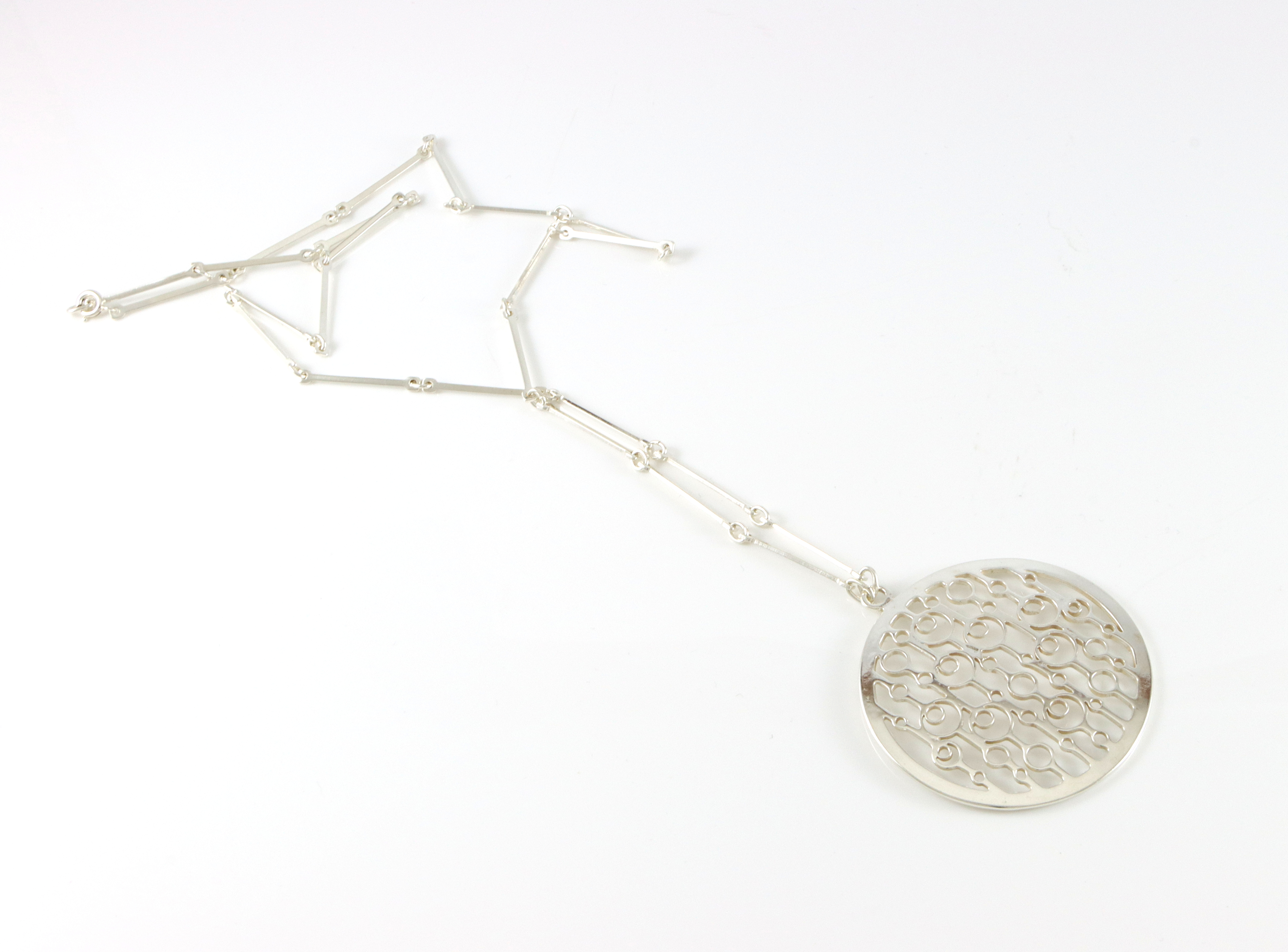 Halskjede med anheng i sølv, designet av Marianne Berg for UNI David-Andersen. Uvanlig variant av dette anhenget med leddet kjede (Kjedet er ikke stemplet, så vanskelig å si om det er orginalt. Men David-Andersen har brukt slikt kjede på flere smykker). Kjedet er ca 65 cm langt, i tillegg kommer anhenget som er 6,0 x 5,5 cm Arkivbilde