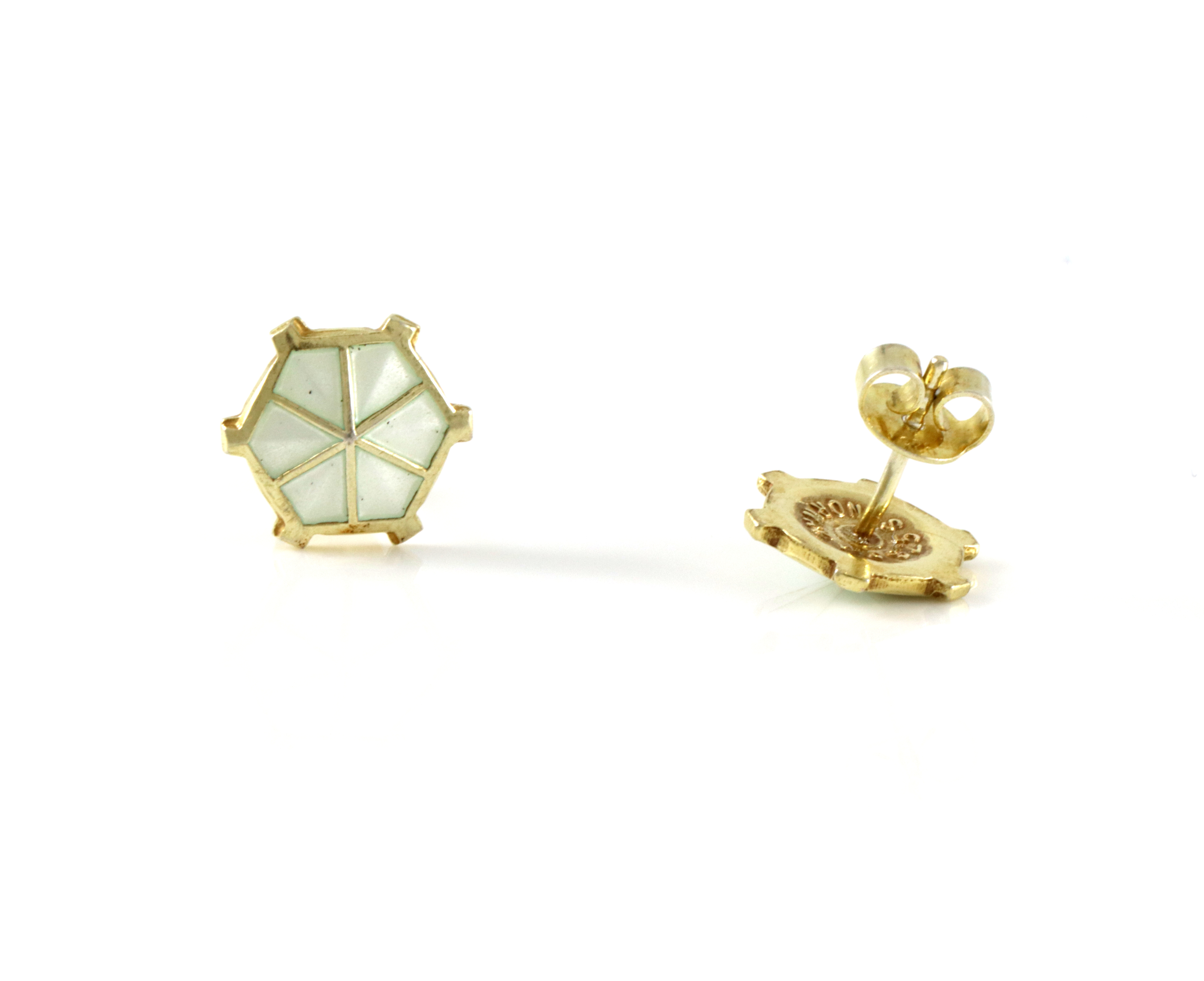 Flott ørepynt med stikk. Forgylt sølv og hvit emalje. Sjelden type å se. 1,0 x 1,0 cm