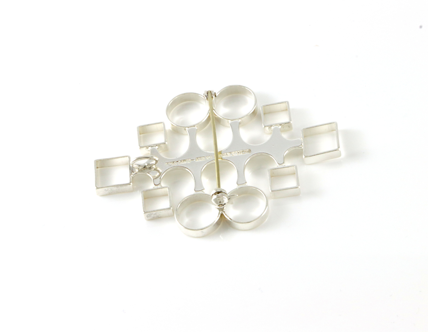 Kombinert anheng og brosje i sølv. Designet av Bjørn Sigurd Østern for David-Andersen. 5,7 x 4,1 cm Arkivbilde