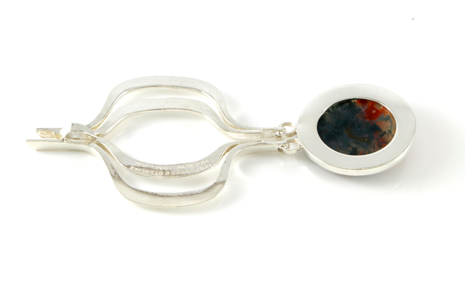 Et helt fantastisk anheng i sølv. Designet av Liv Solnør Rogan. Anhenget er hele 11,2 cm langt og 5,0 cm bredt. Stenen er trolig en form for agat, stenen har en sprekk fra venstre mot midten.