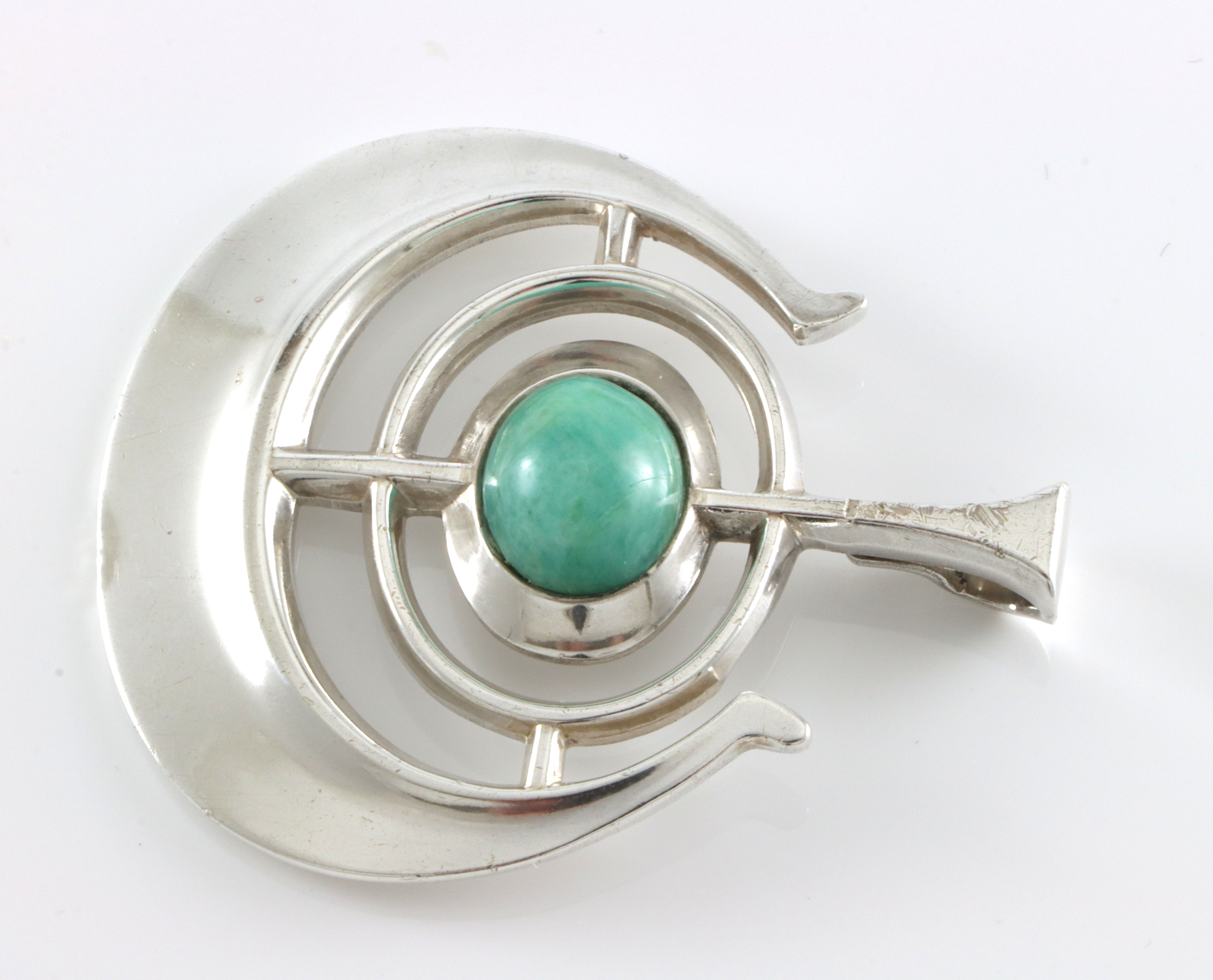 Anheng i sølv med amasonitt. Anhenget heter "Lykkeskip", er designet av Bjørn Sigurd Østern. Produsent David-Andersen. 4,4 x 5,1 cm Øsken har en del hakk