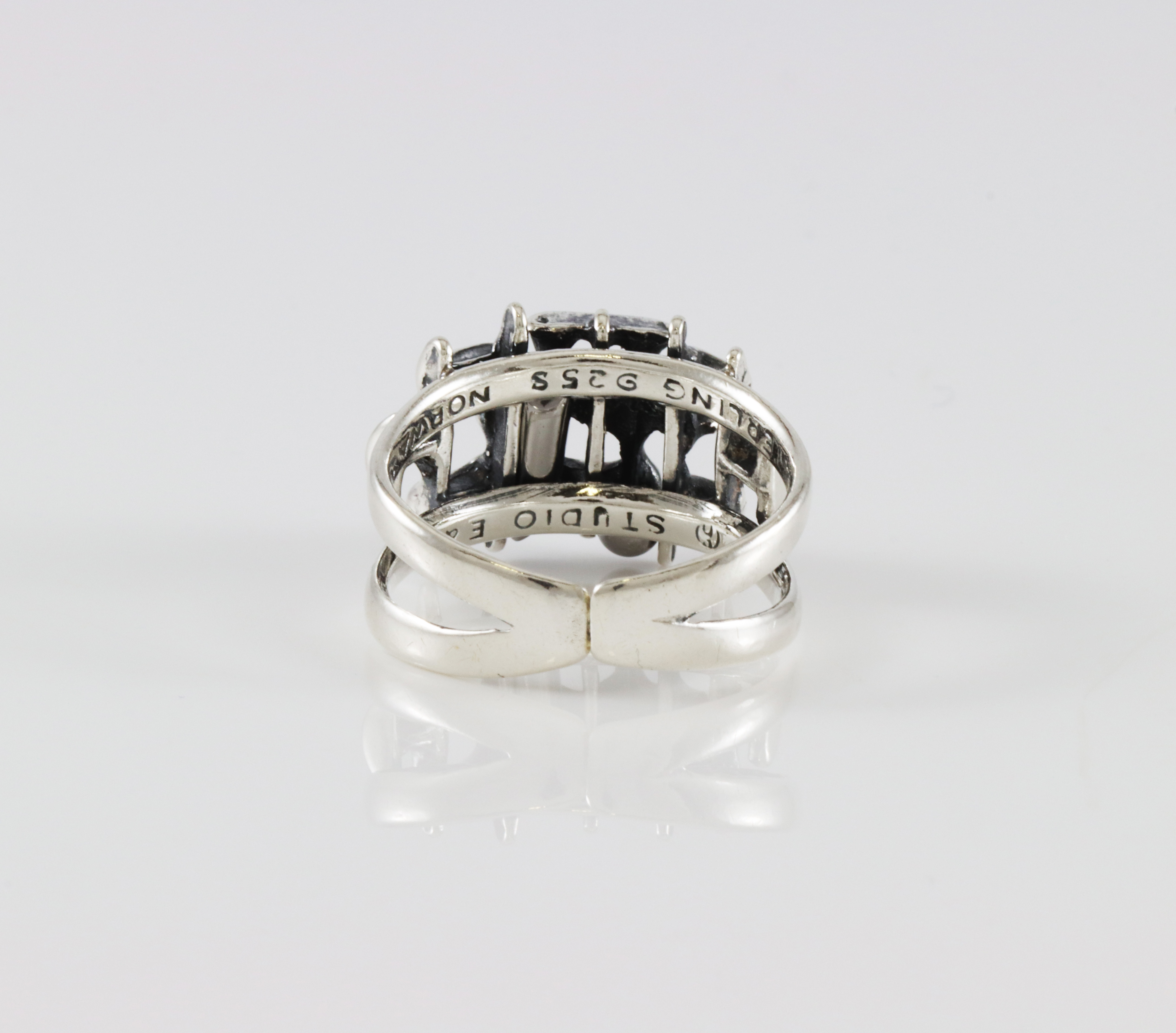 Stilig ring i sølv i typisk stil fra Studio Else & Paul. Ringstørrelse: 52,5. Skinnen er todelt, så kan smått justeres.
