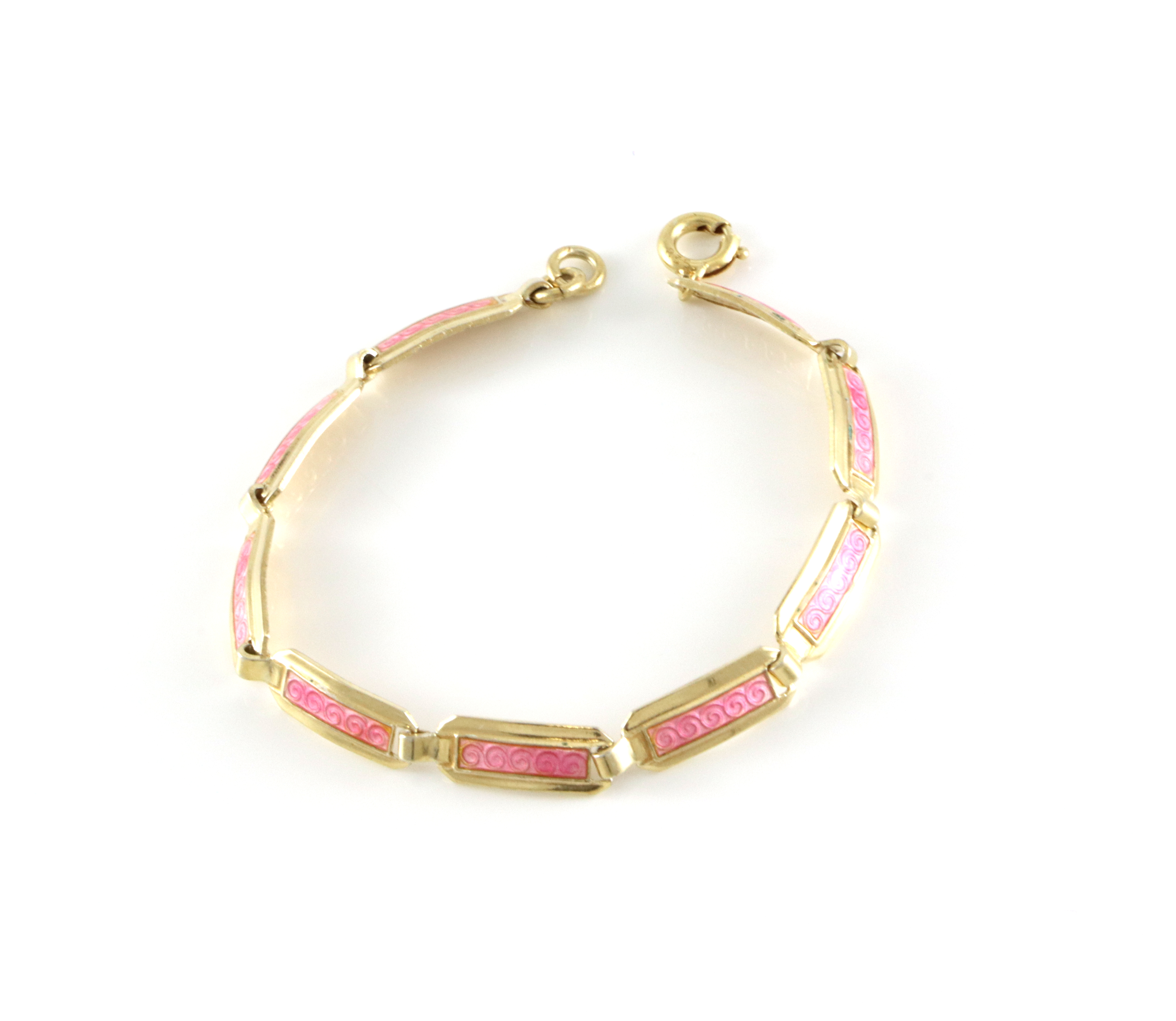 Armlenke i forgylt sølv med rosa emalje. Lengde: 14,5 cm Bredde: 0,5 cm Produsent: Arne Nordlie