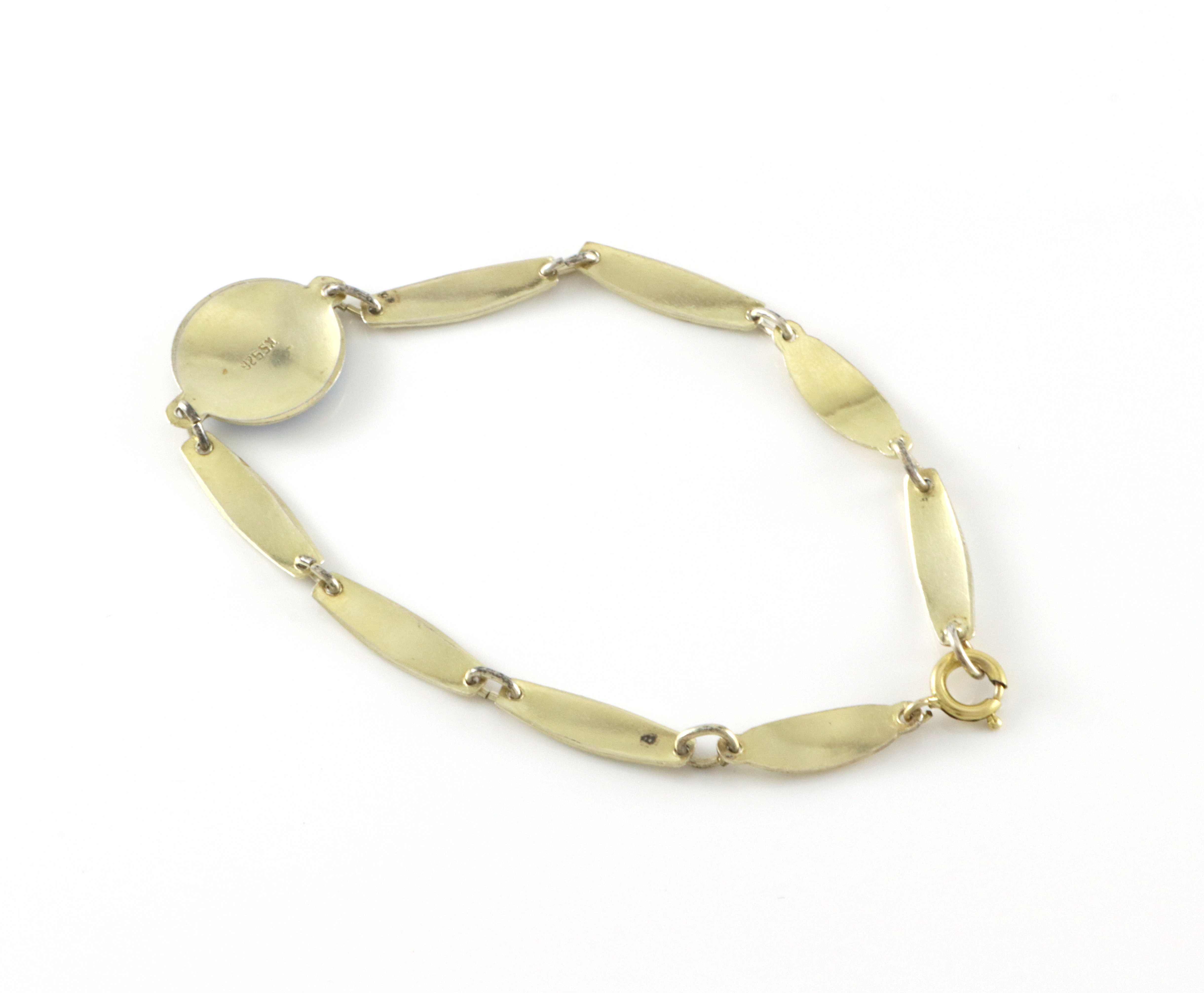 Armlenke i forgylt sølv med hvit emalje. Lenken ser ut til å være forlenget med ledd som er ulik de orginale.