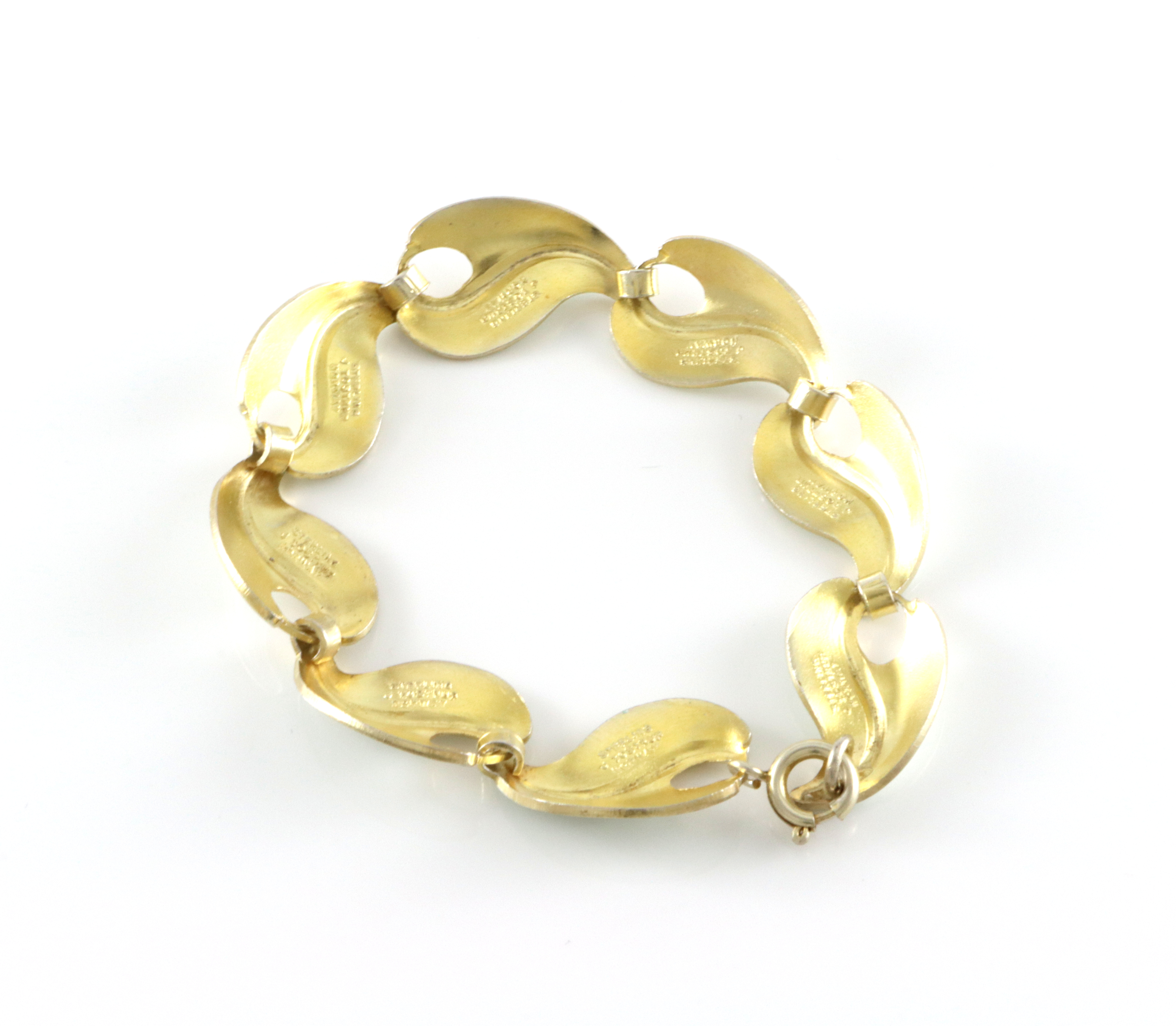 Armlenke i forgylt sølv med hvit emalje, produsert av Tostrup.