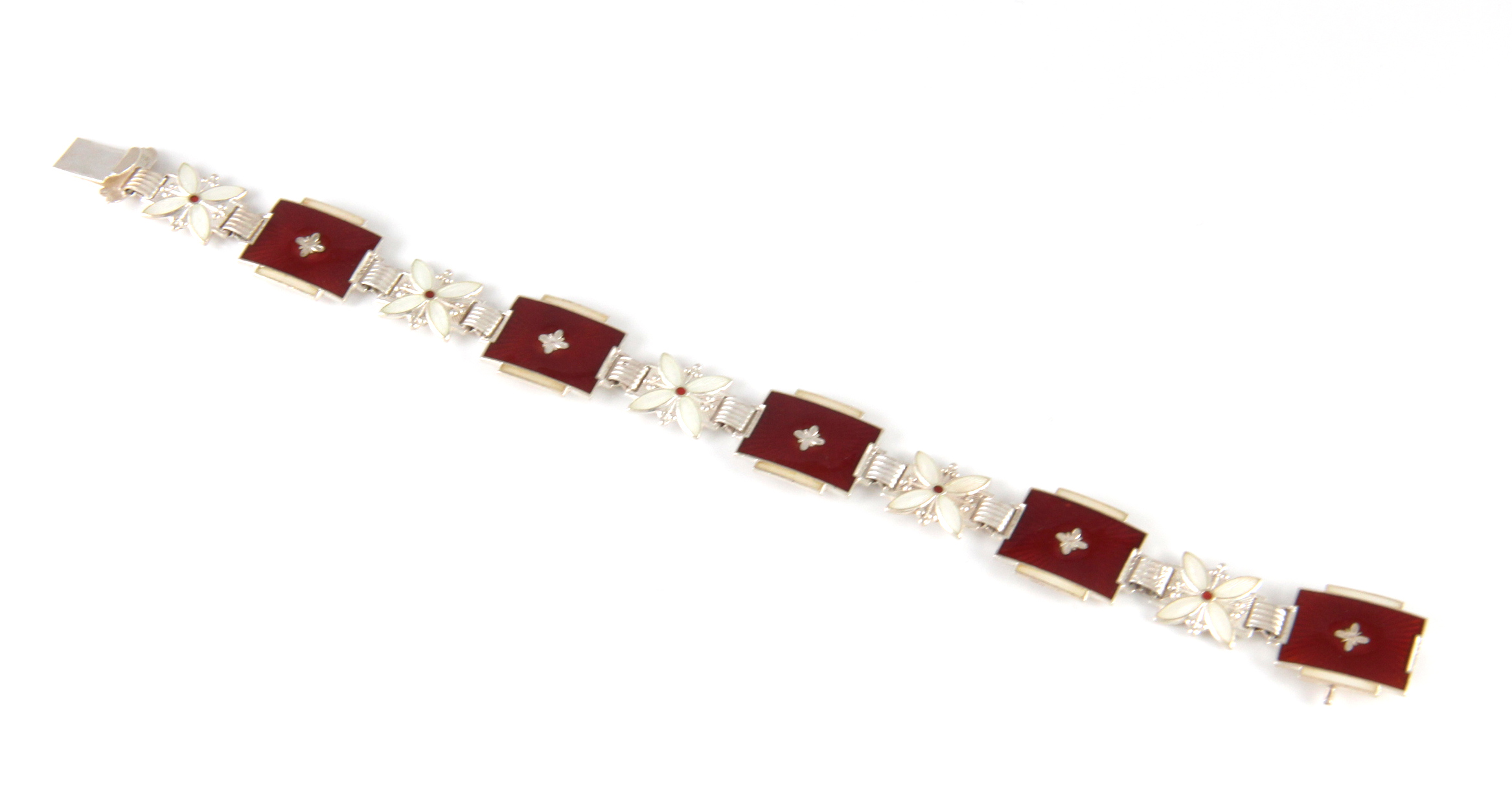 Lengde: 18,0 (Uten låsetapp) Bredde: 0,9 cm Produsent: Norne (Aksel Holmsen) Tilstand: Emaljen er hel og pen, ikke forgyldt, enkel lås (Den ekstra låsetappen på siden er knekt av)