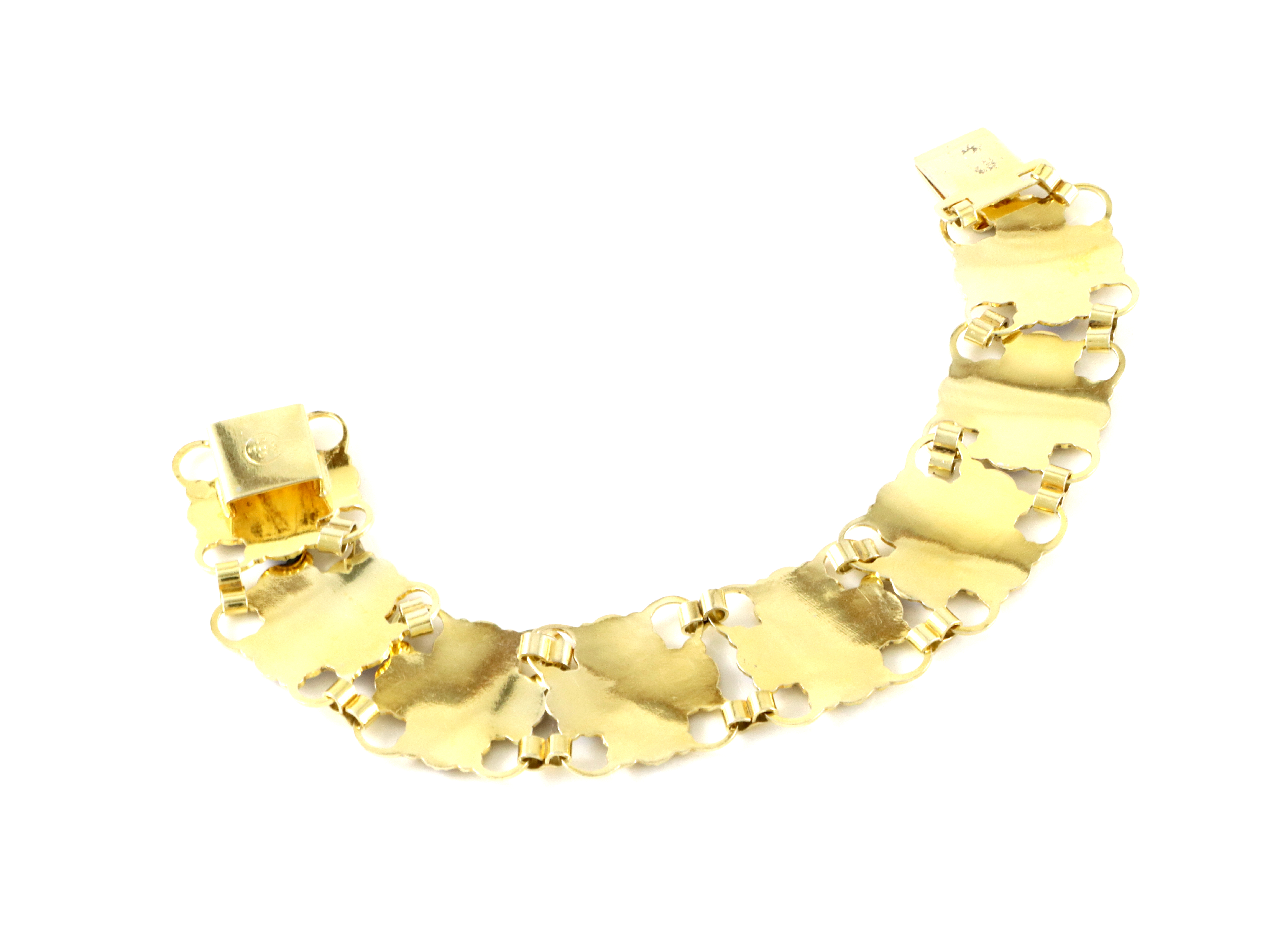 Fantastisk armlenke i forgylt sølv. Blå og hvit emalje. 18,9 cm lang og 2,0 cm bred. Kan neppe være mye brukt, fantastisk forgylning og emalje. Råflott sak!