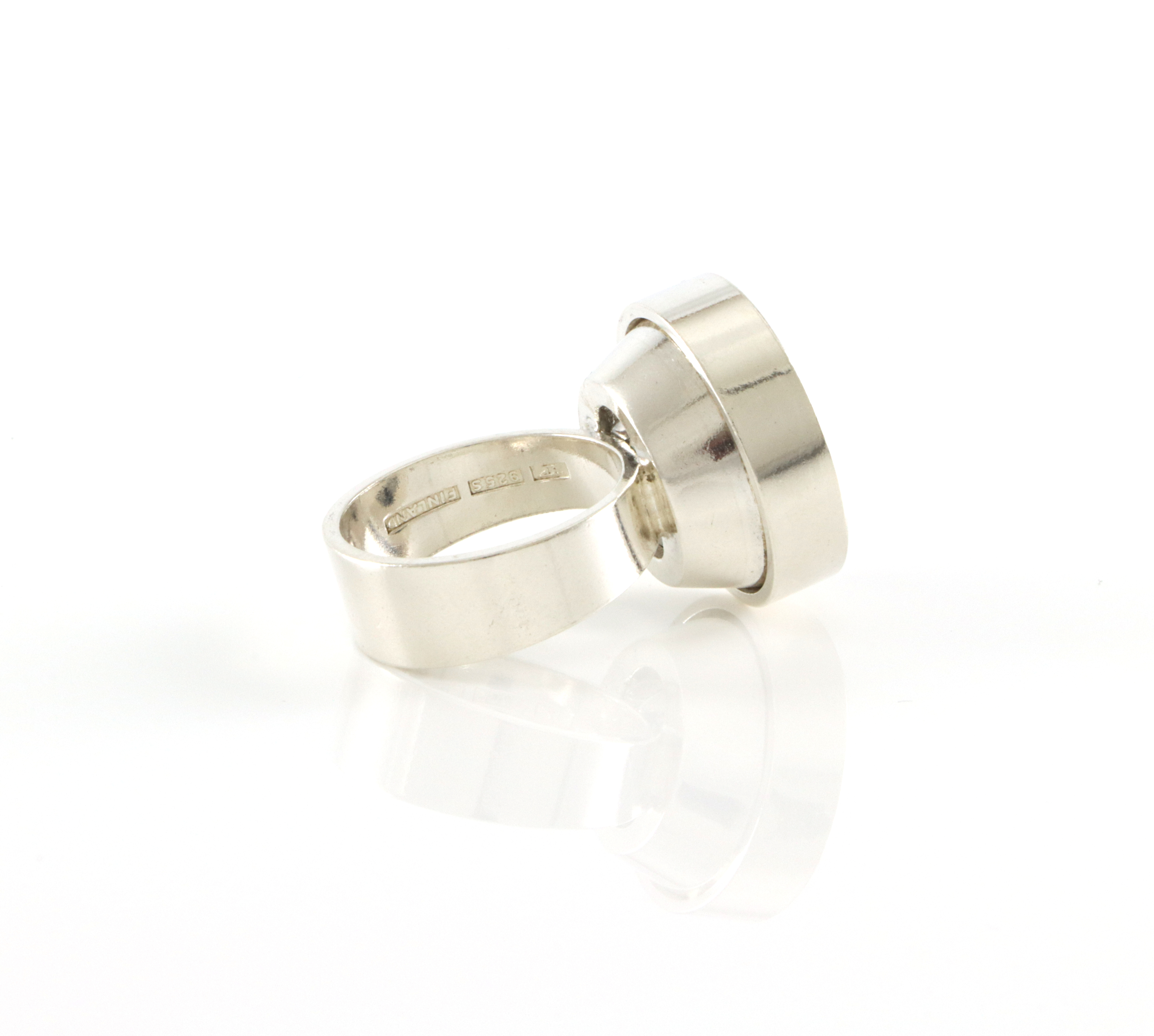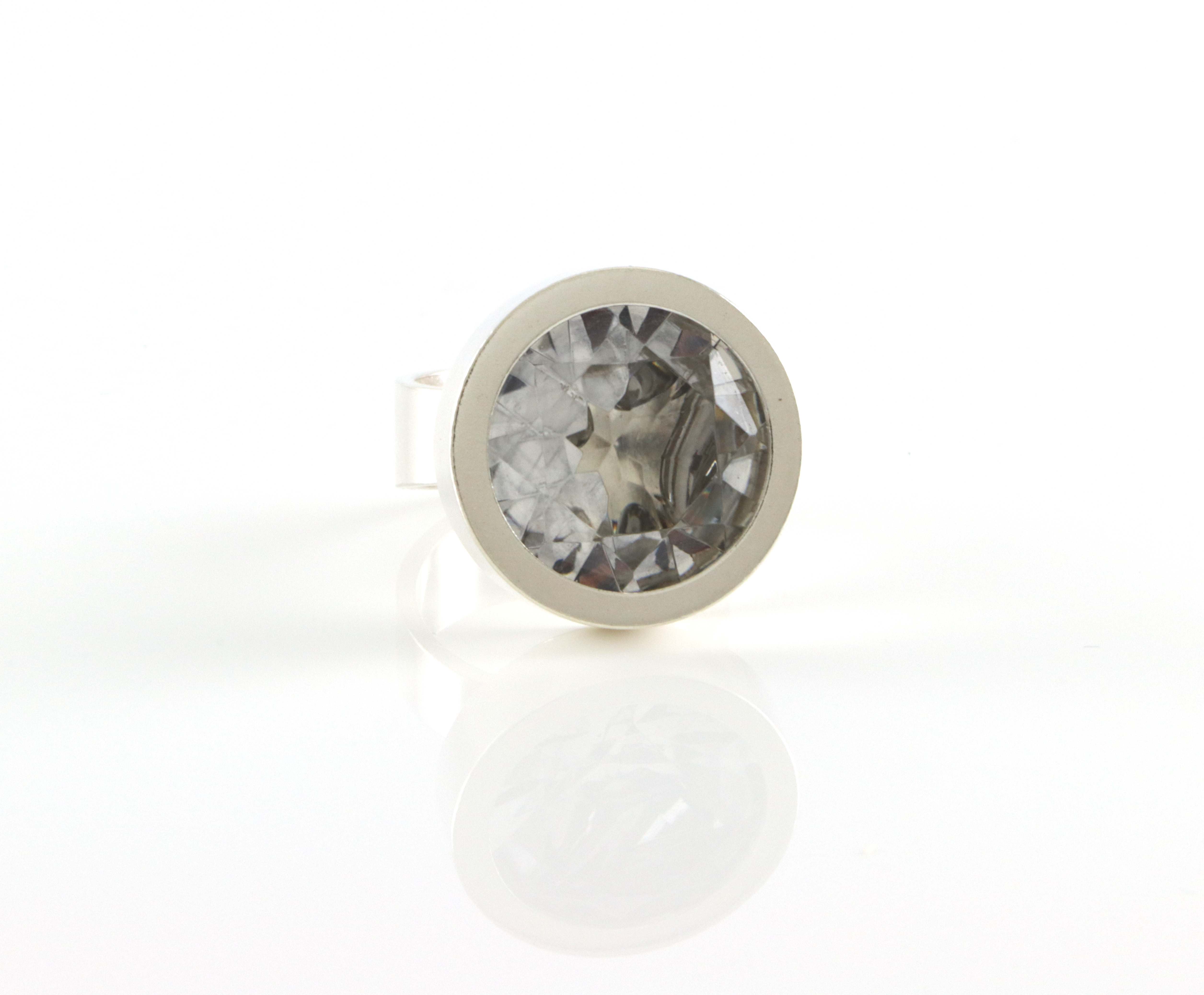 Ring i sølv med stor bergkrystall. Produsert av Kupittaan Kulta (Elis Kauppi) Ringstørrelse 54/55 (Noe vanskelig å måle med såpass tjukk ring) Veldig populær type, ofte er steinen løs eller skadet. Men denne er perfekt.