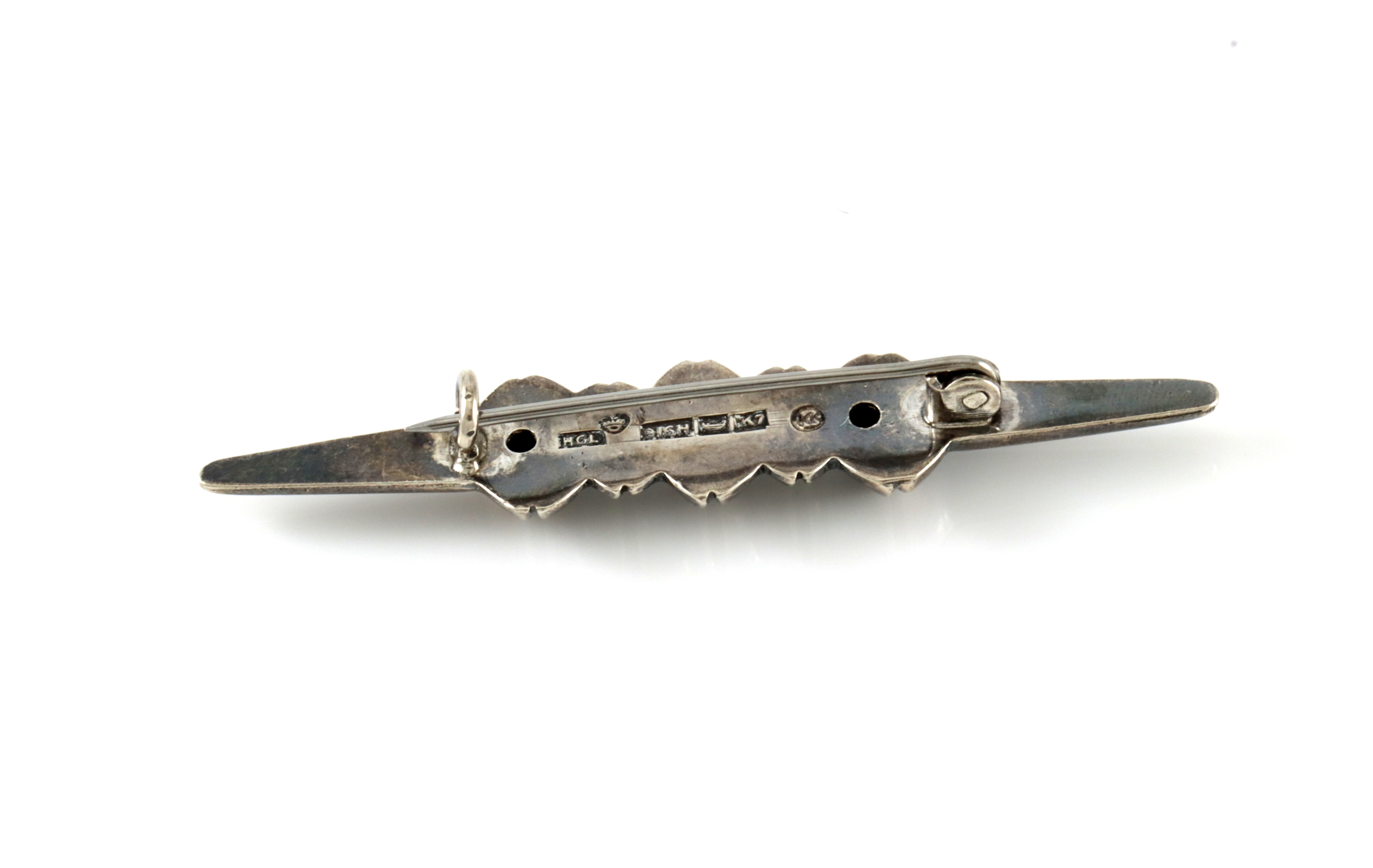 Brosje i oksidert sølv. Produsert i 1963 av Kalevala Koru i Finland. 6,2 x 1,2 cm