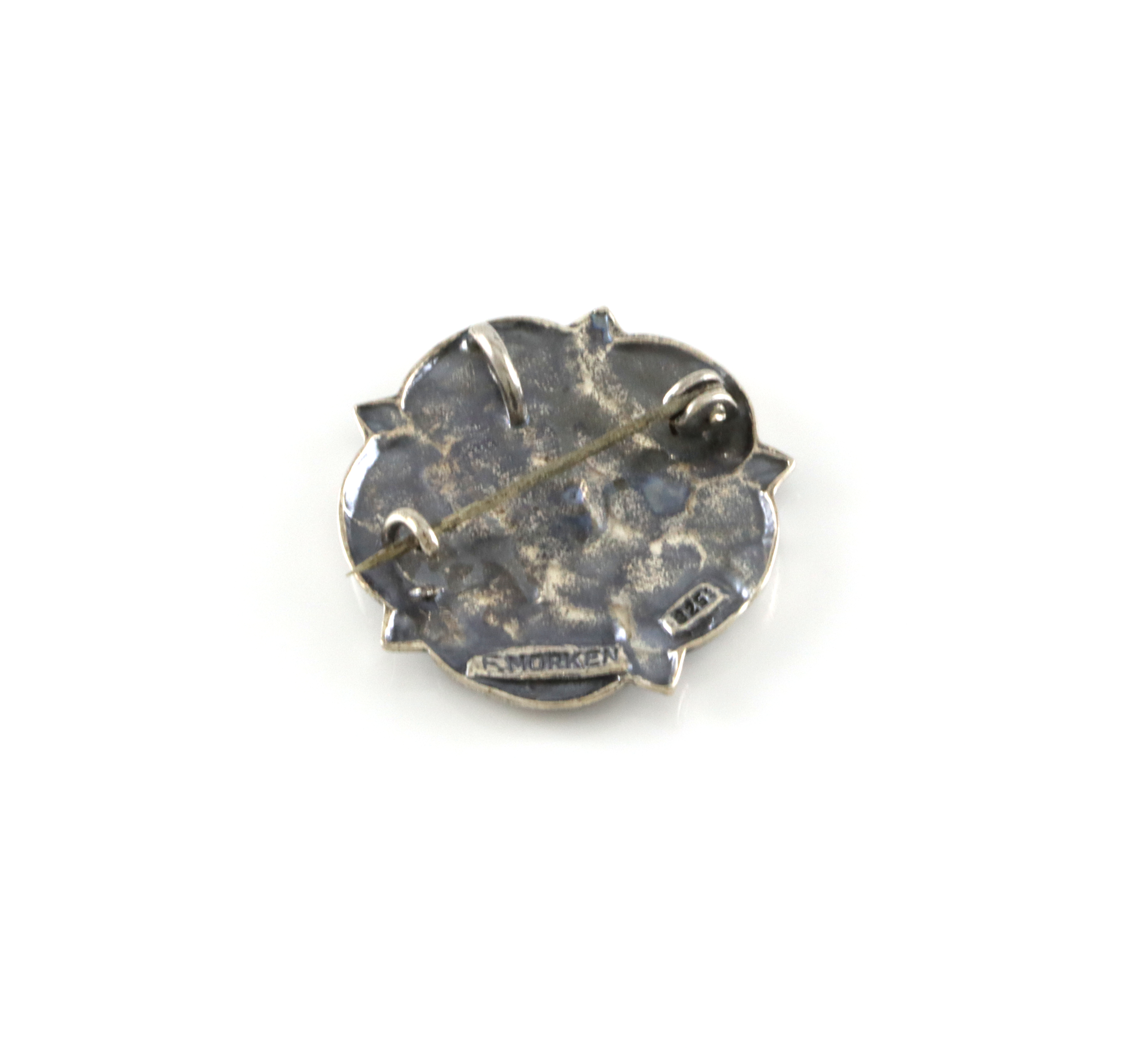 Kombinert anheng og brosje i oksidert sølv. Motivet er "Trondhjemsrosa". Produsert av Gullsmed Morken. 2,9 x 2,9 cm