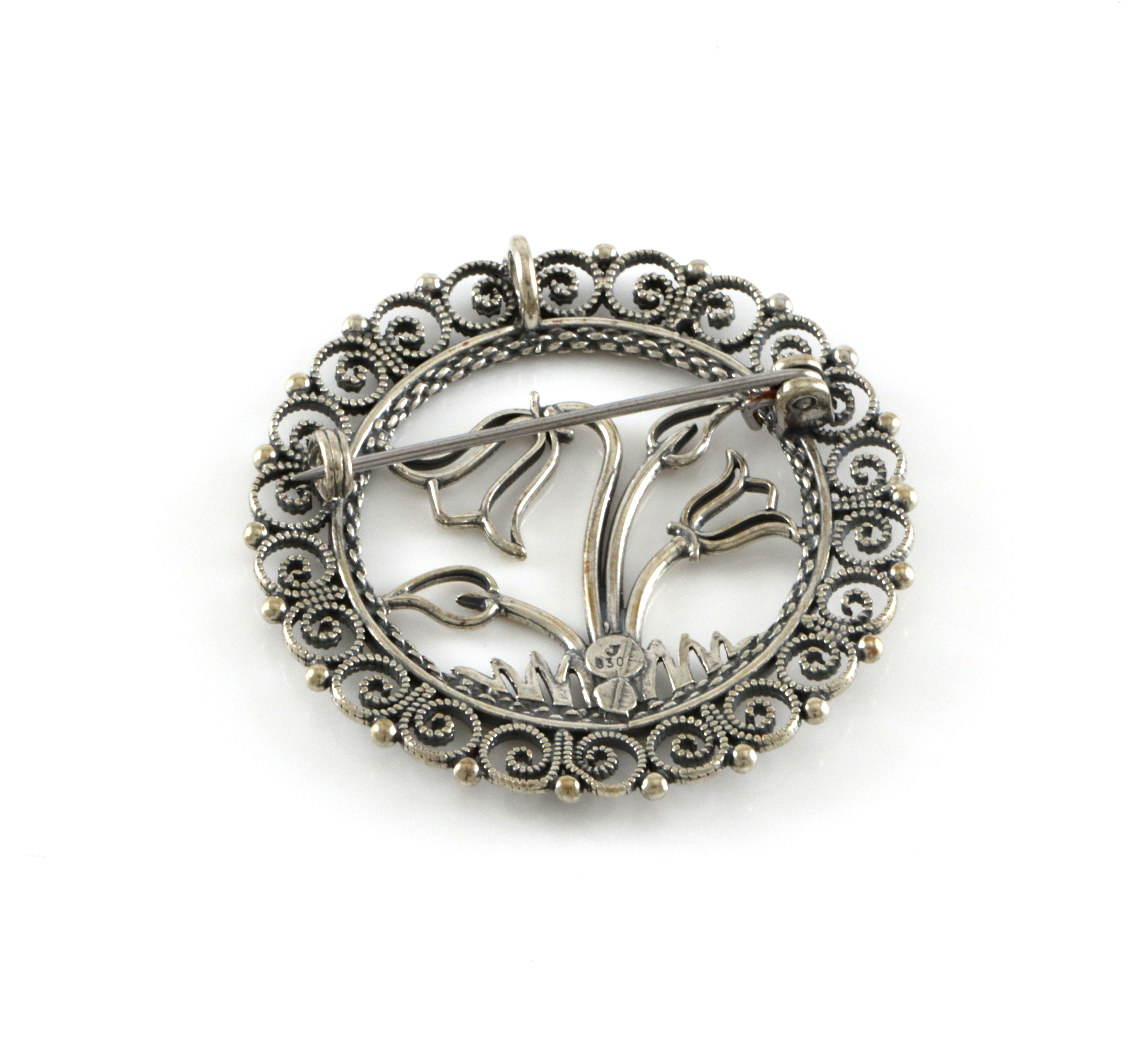 Kombinert anheng og brosje i sølv. Produsert av Sylvsmidja. Motiv er blåklokke, tidligere har vi bare sett denne versjonen med Tromsøpalme. 4,3 x 4,3 cm