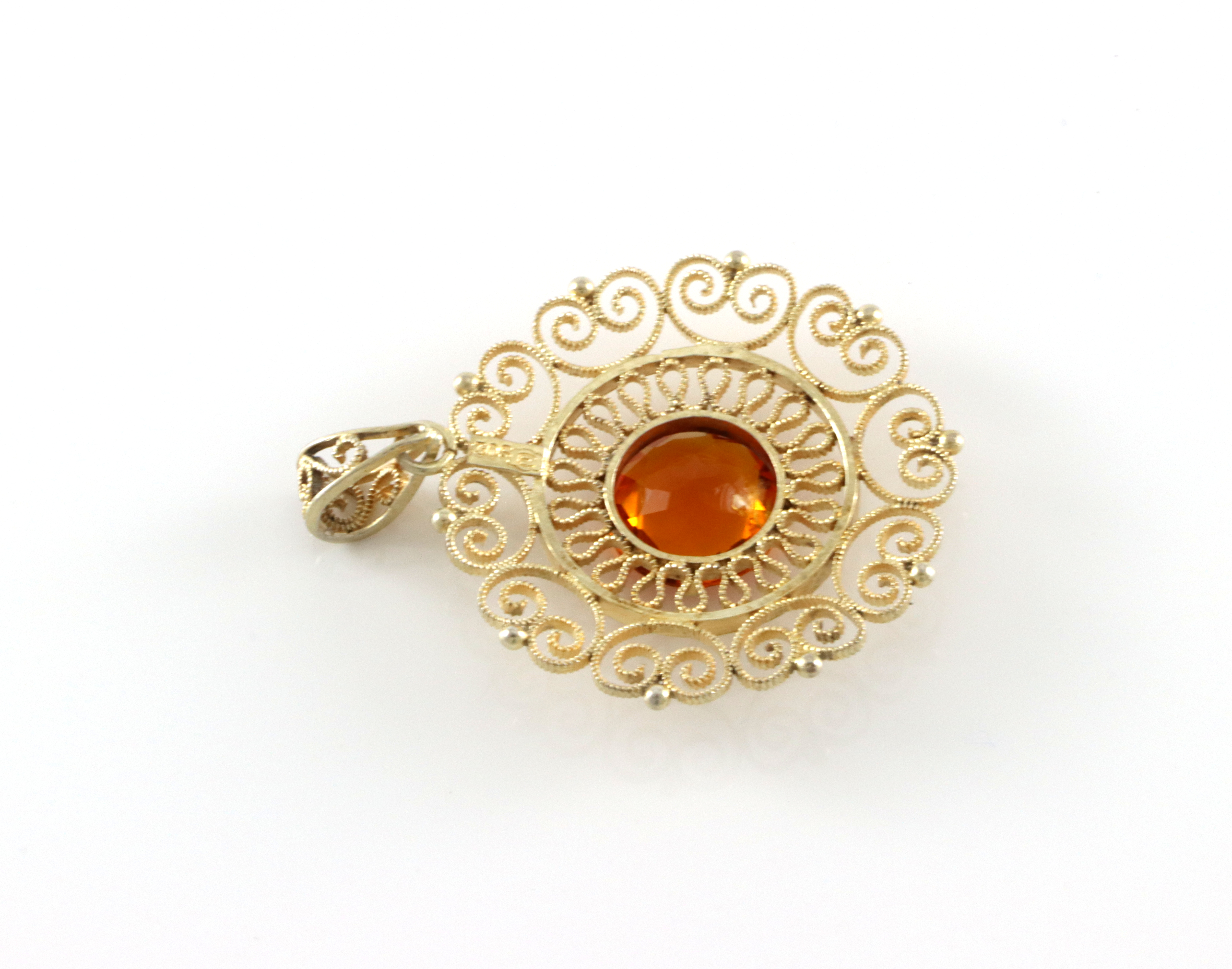 Fantastisk flott anheng i forgylt sølv med orange stein. Produsert av Nils Elvik. 4,0 x 2,9 cm