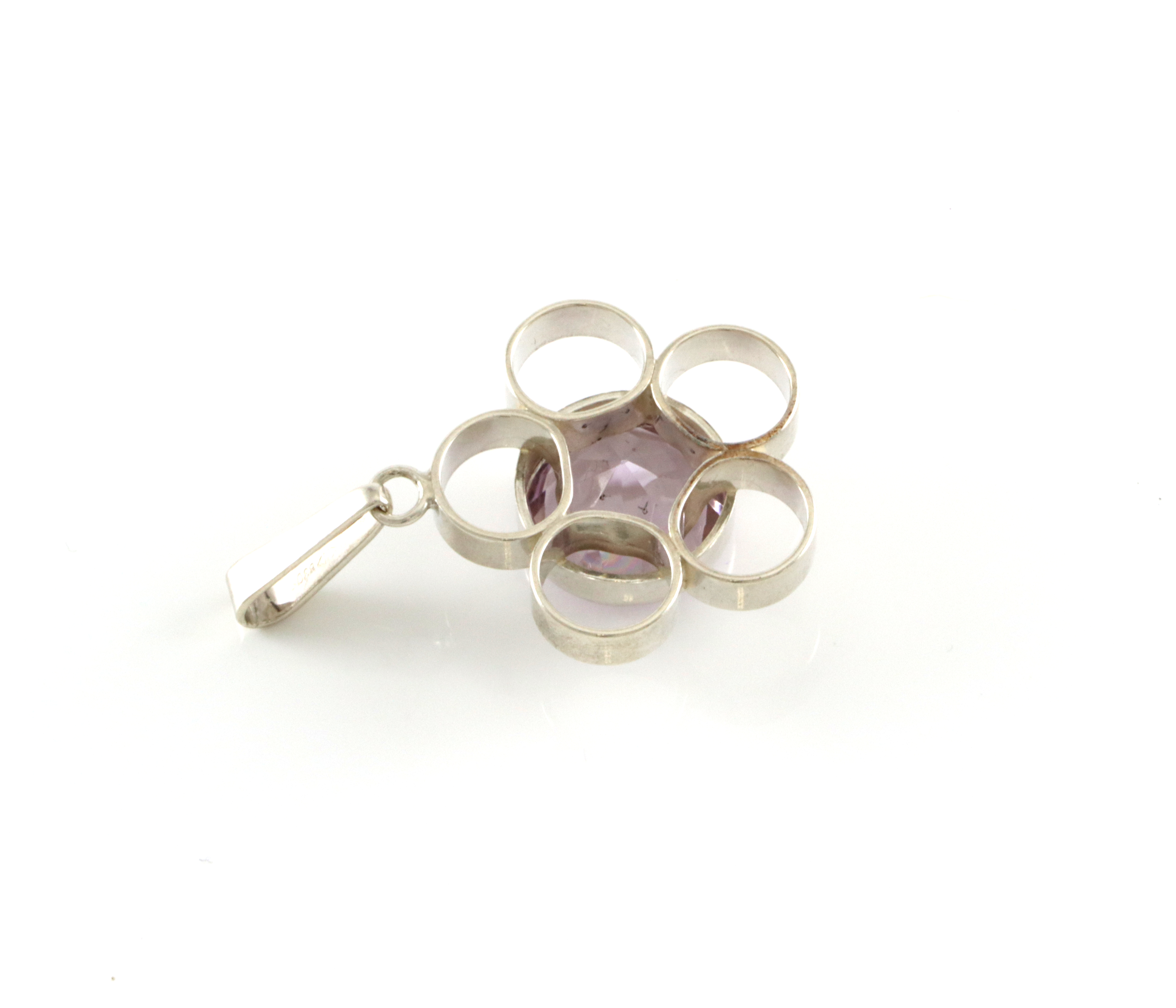 Anheng i sølv med ubestemmelig stein (Noe grå/lilla skjær). Produsert av Arne Nordlie. 4,3 x 2,6 cm