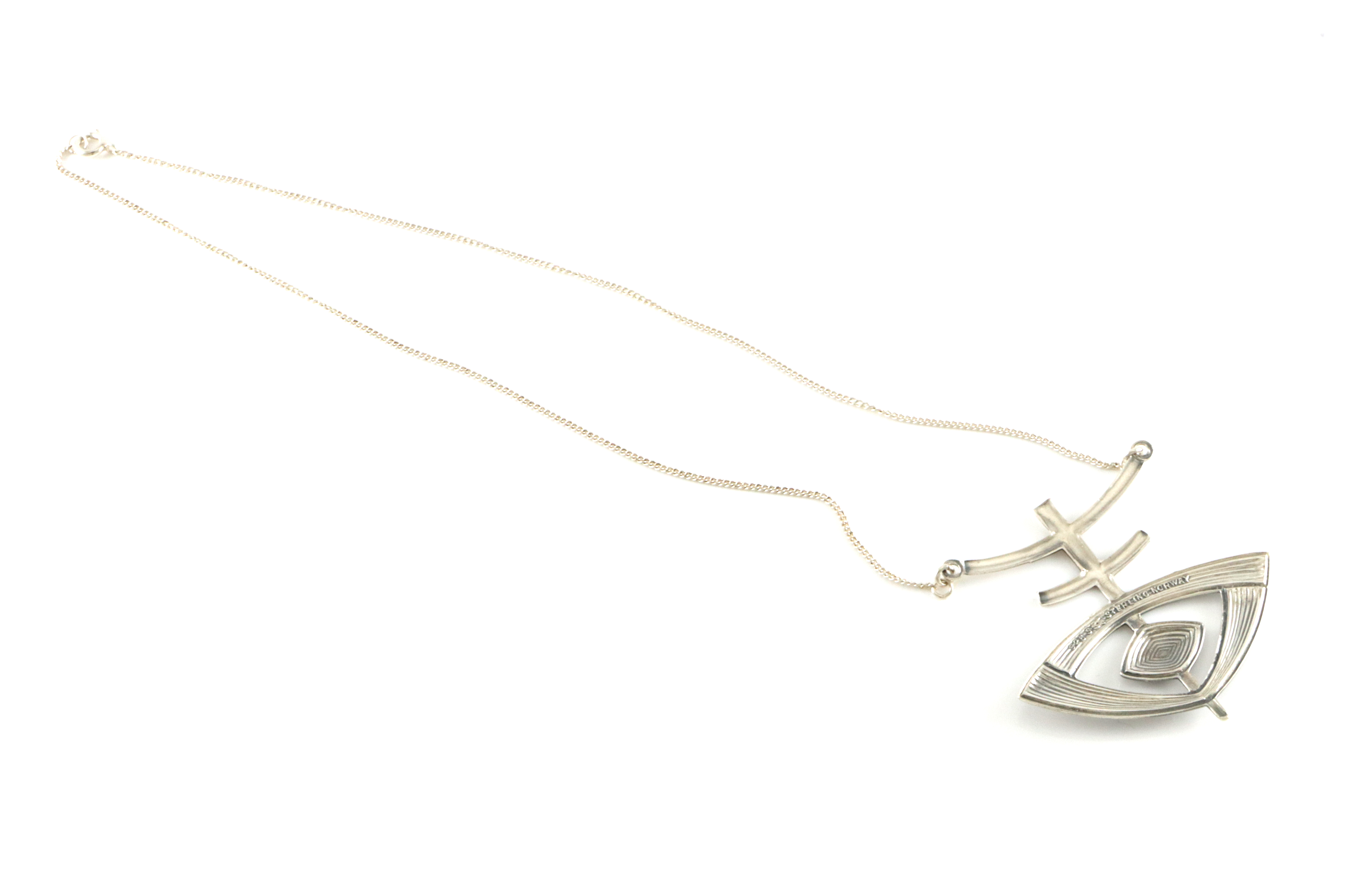 Stilig anheng og kjede i sølv. Produsert av Aksel Holmsen. Kjedet er ca 40 cm langt, i tillegg kommer bredden på smykket som er 4 cm. Selve anhenget måler: 4,9 x 4,9 cm