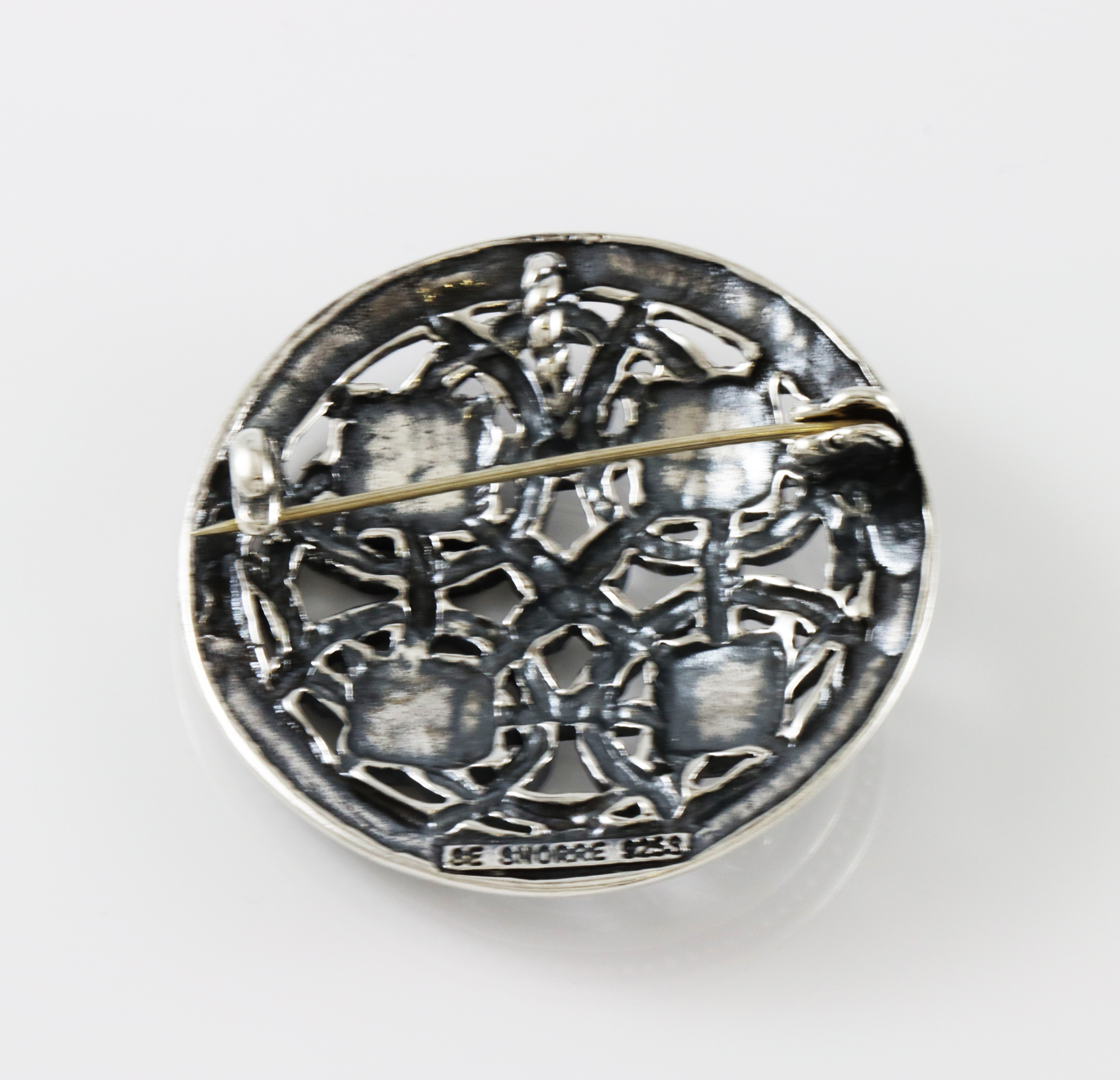 Kombinert anheng og brosje i sølv, produsert av Sigmund Espeland. Fra Snorreserien. Nypris 1395 (Mars 2024) 4,3 x 4,3 cm