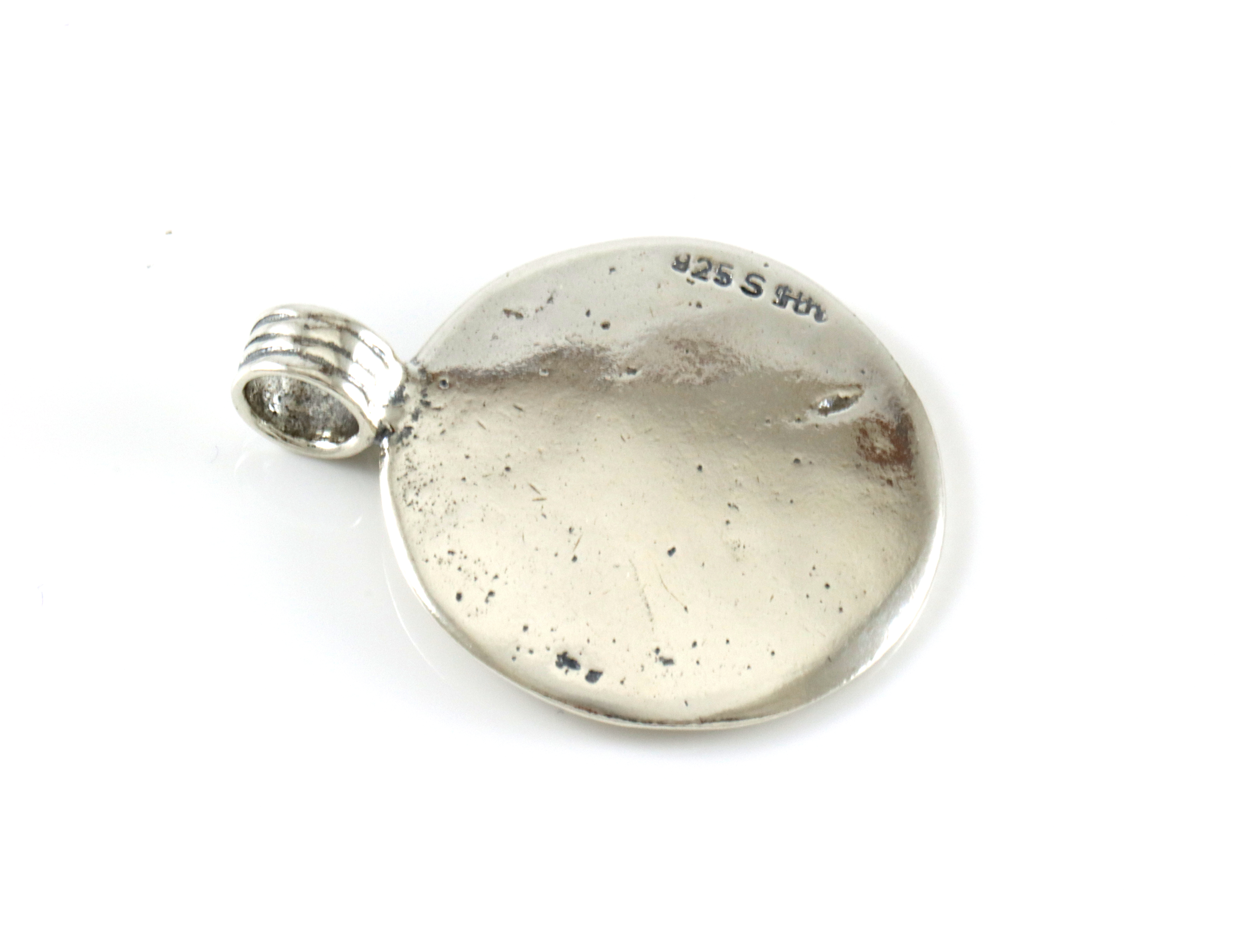 Anheng i sølv med enkel blomsterdekor, virker litt inspirert av gamle bondeknapper fra 1700-tallet. 3,1 x 2,4 cm