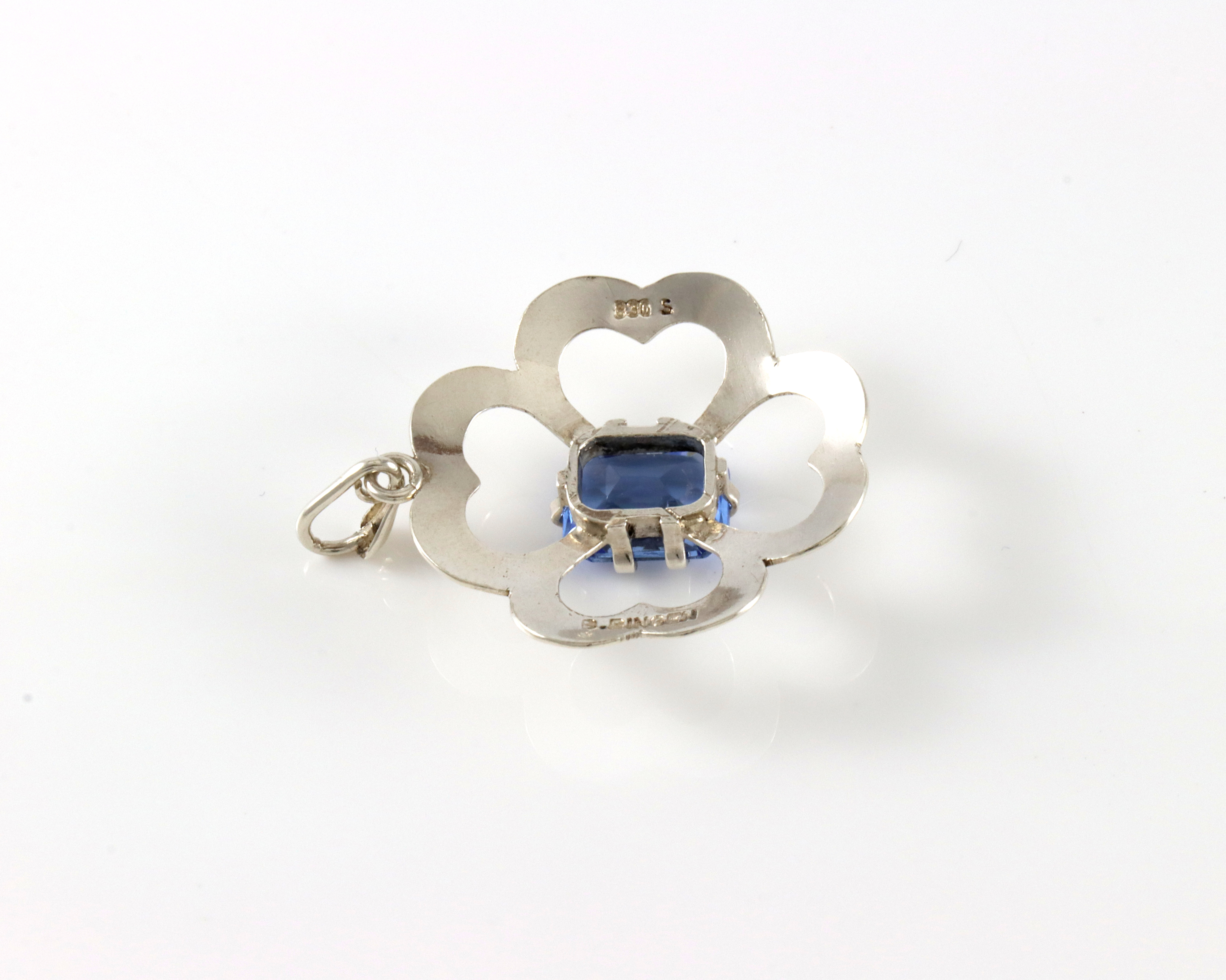 Firkløverformet anheng i sølv med blå stein. Mesterstemplet B.Bingen (Som trolig er Birger Bingen) 3,6 x 2,7 cm