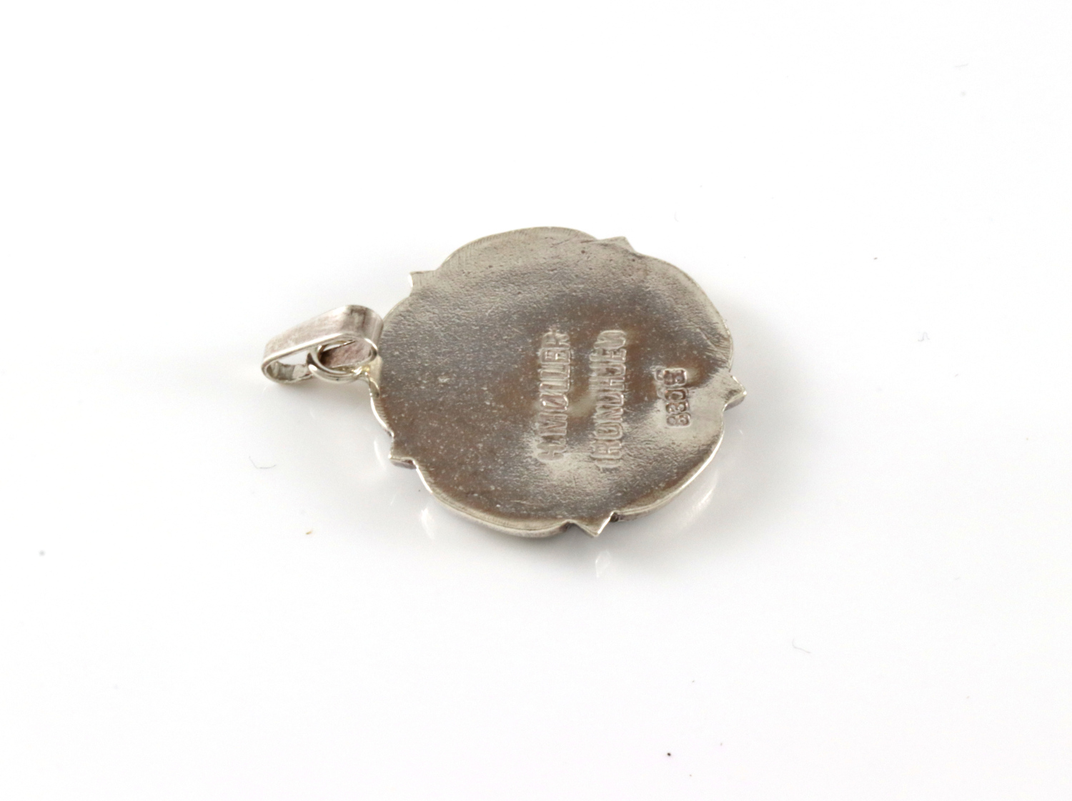 Anheng i sølv Trondhjemsrosa, produsert av Møller. 3,2 x 2,1 cm